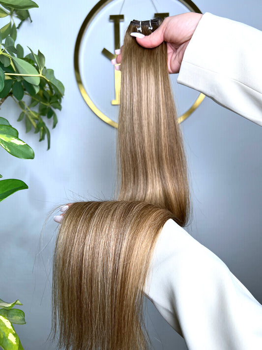 TRESSEN #SUN-KISSED BALAYAGE MITTELBRAUN UND GESTRÄHNTES LICHTBLOND GOLD RU GLATT CLASSIC WEFT ♡