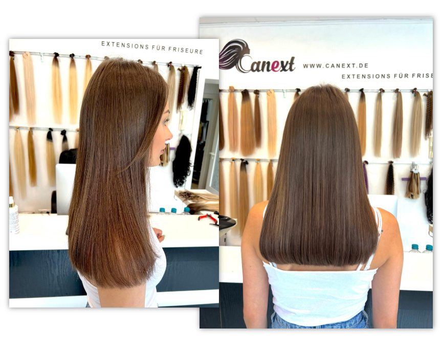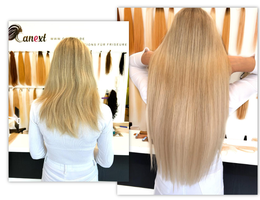 Mit unseren Tape In Extensions von Canext ermöglichen dir eine traumhafte und haarschonende Haarverlängerung. Sie sind mit hochwertigen Klebestreifen bestückt, welche man im beschriebenen Sandwichverfahren an deinem Eigenhaar befestigt. Durch den extra dafür entwickelten Kleber, der zugleich dein Haar nicht beschädigt, kannst du deine Extensions im Schnitt 8-12 Wochen tragen. Die Voraussetzung dafür ist eine professionelle Einarbeitung. Diese bekommst du natürlich auch bei uns.