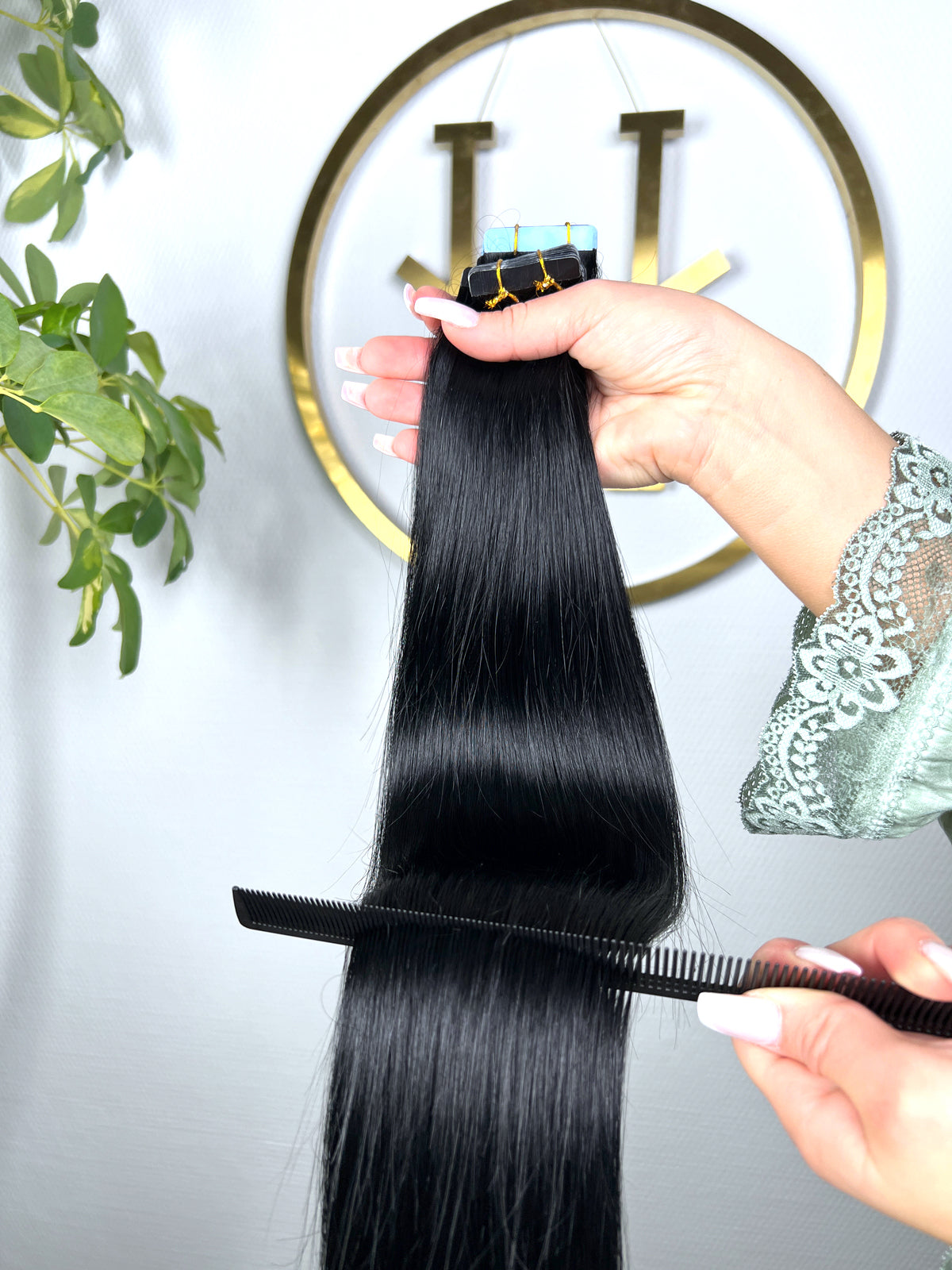 Usbekisches Haar ist von Natur aus leicht, fein und mit einer sanften Naturwelle. Dadurch wirken die Tape Extensions besonders natürlich und passen sich optimal an europäisches Haar an.