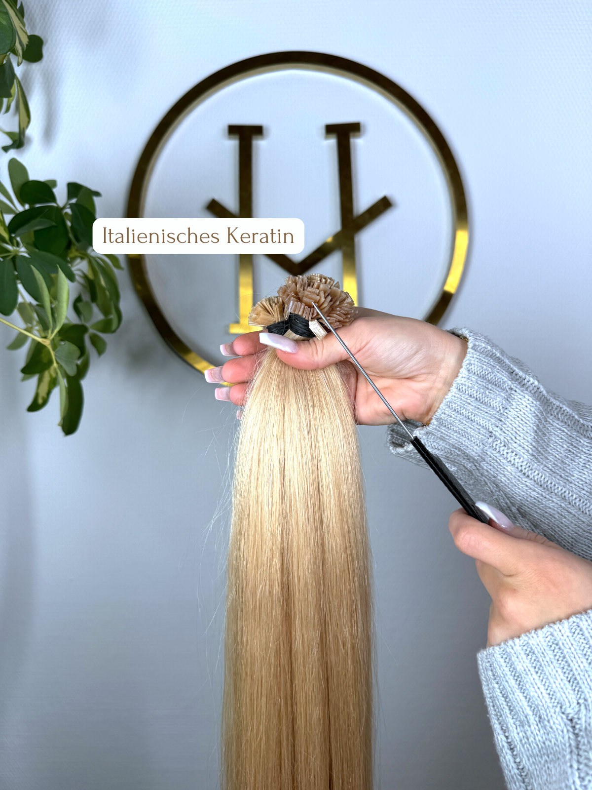 Usbekisches Haar ist leicht, fein und hat oft eine sanfte Naturwelle. Dadurch wirken die Bondings besonders natürlich und passen sich optimal an feines bis normales Eigenhaar an.