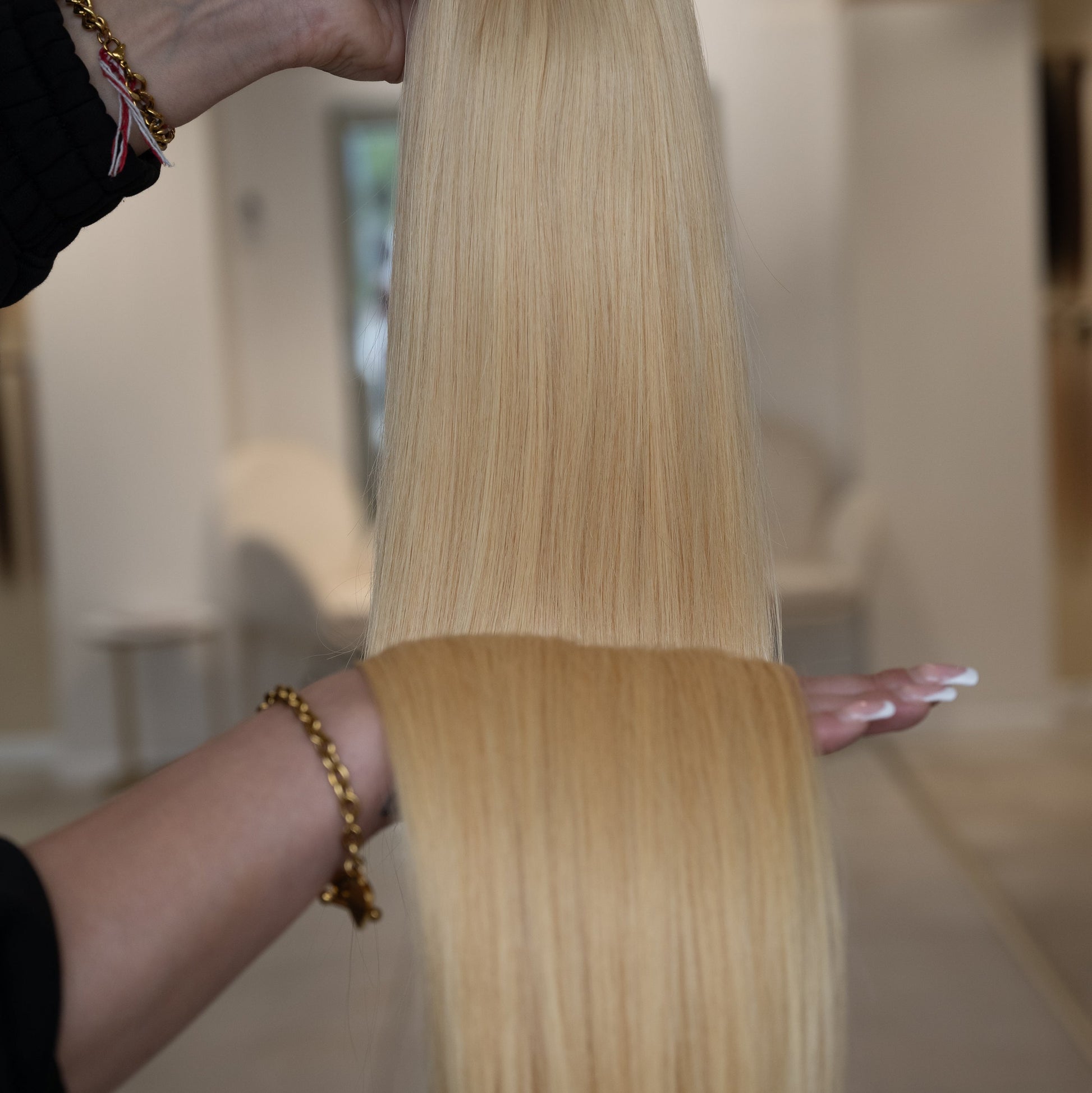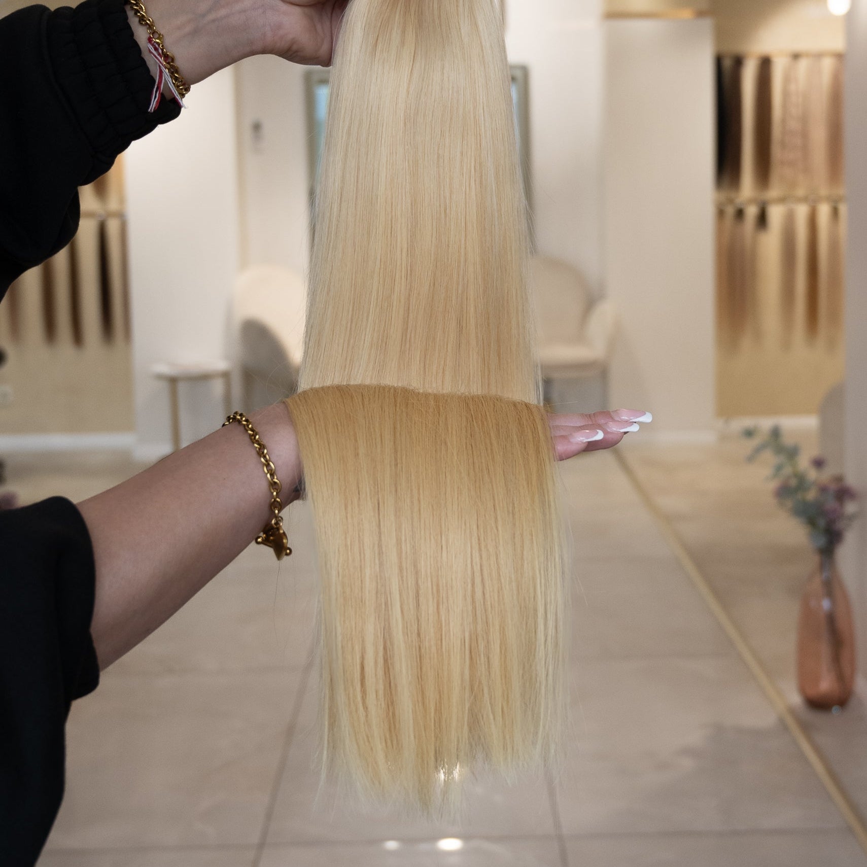Für optimale Ergebnisse empfehlen wir unsere speziell entwickelte Pflegeserie „blessed“, die ideal auf die Bedürfnisse von Extensions abgestimmt ist.