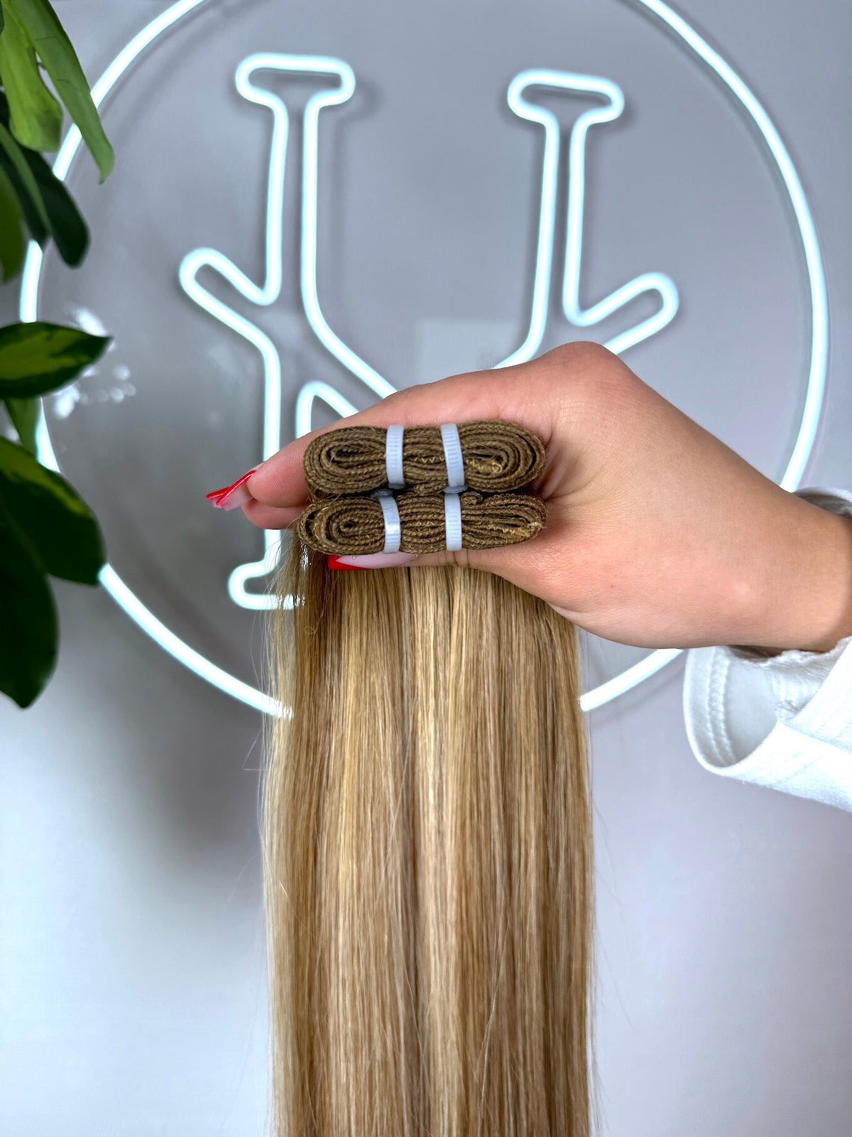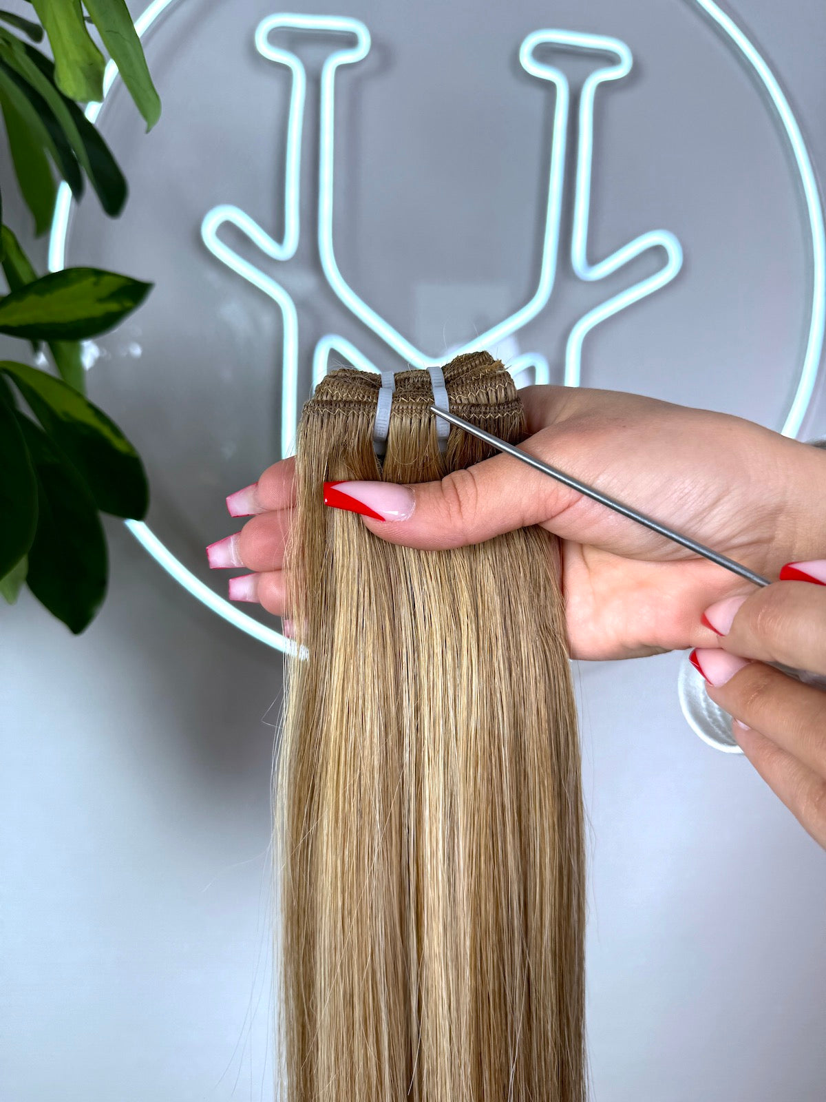 Unsere usbekischen Tressen-Extensions zaubern im Handumdrehen eine haarschonende Haarverlängerung oder Haarverdichtung mit Volumen. Sie sind äußerst vielseitig einsetzbar und lassen sich individuell zuschneiden. Die Befestigung kann entweder durch Nähen erfolgen oder mithilfe der Weaving-Methode und Mikroringen. Bei der Weaving-Methode wird das Haar geflochten und die Extensions werden anschließend eingenäht. Mikroringe bieten eine schonende Befestigung ohne Hitze, was das Entfernen und Hochsetzen der Extensions erleichtert. Die fein gewebten Verbindungsstellen liegen angenehm an der Kopfhaut an und sorgen für zusätzlichen Tragekomfort.