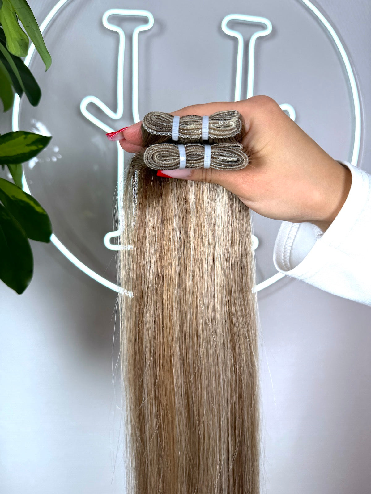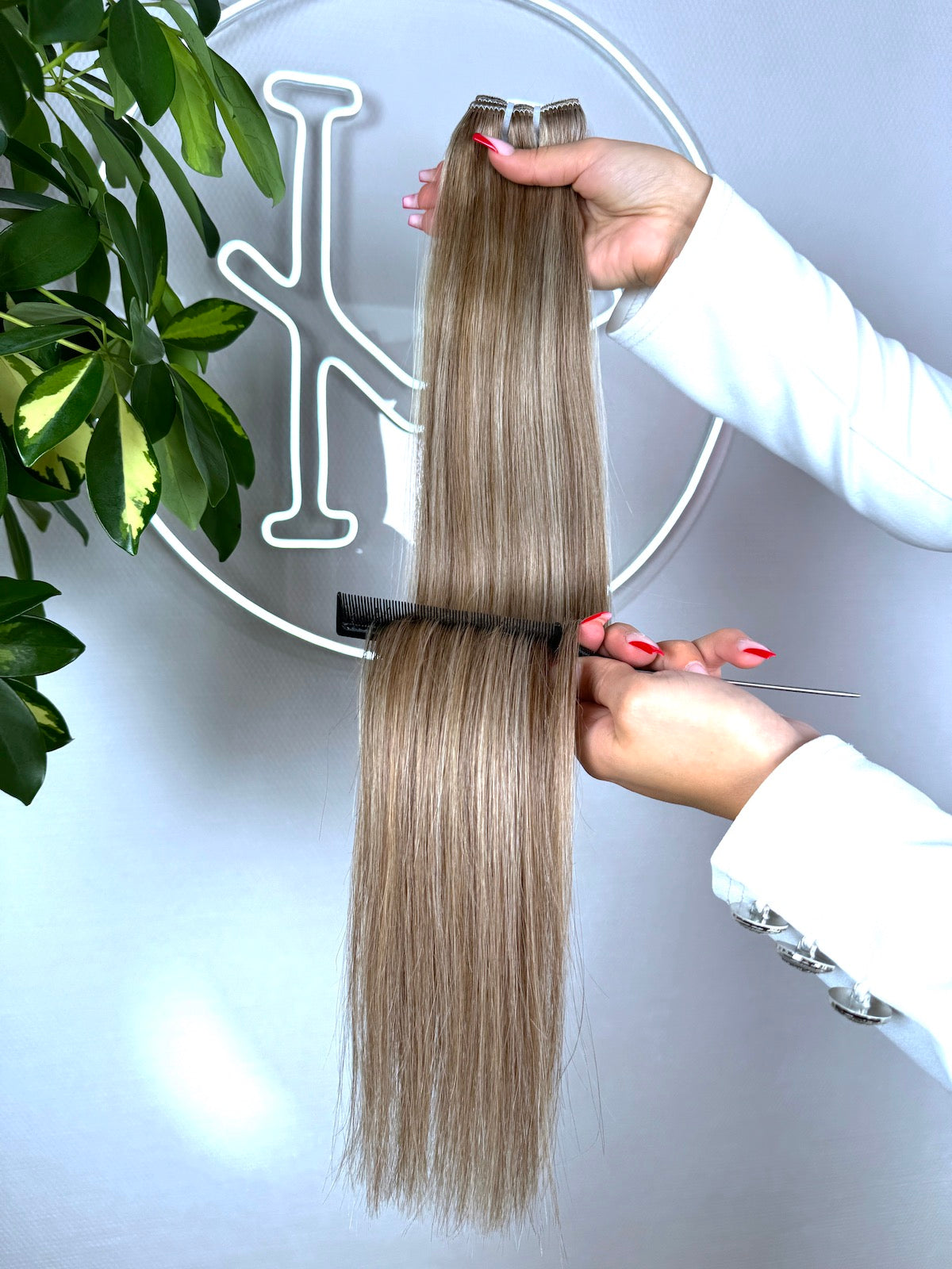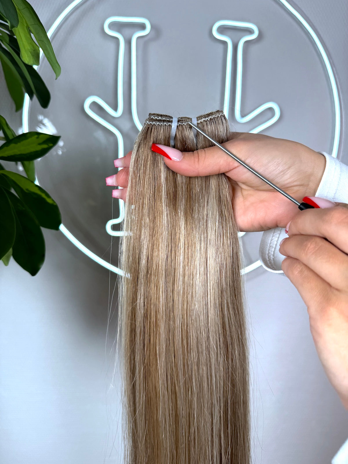Unsere usbekischen Tressen-Extensions zaubern im Handumdrehen eine haarschonende Haarverlängerung oder Haarverdichtung mit Volumen. Sie sind äußerst vielseitig einsetzbar und lassen sich individuell zuschneiden. Die Befestigung kann entweder durch Nähen erfolgen oder mithilfe der Weaving-Methode und Mikroringen. Bei der Weaving-Methode wird das Haar geflochten und die Extensions werden anschließend eingenäht. Mikroringe bieten eine schonende Befestigung ohne Hitze, was das Entfernen und Hochsetzen der Extensions erleichtert. Die fein gewebten Verbindungsstellen liegen angenehm an der Kopfhaut an und sorgen für zusätzlichen Tragekomfort.