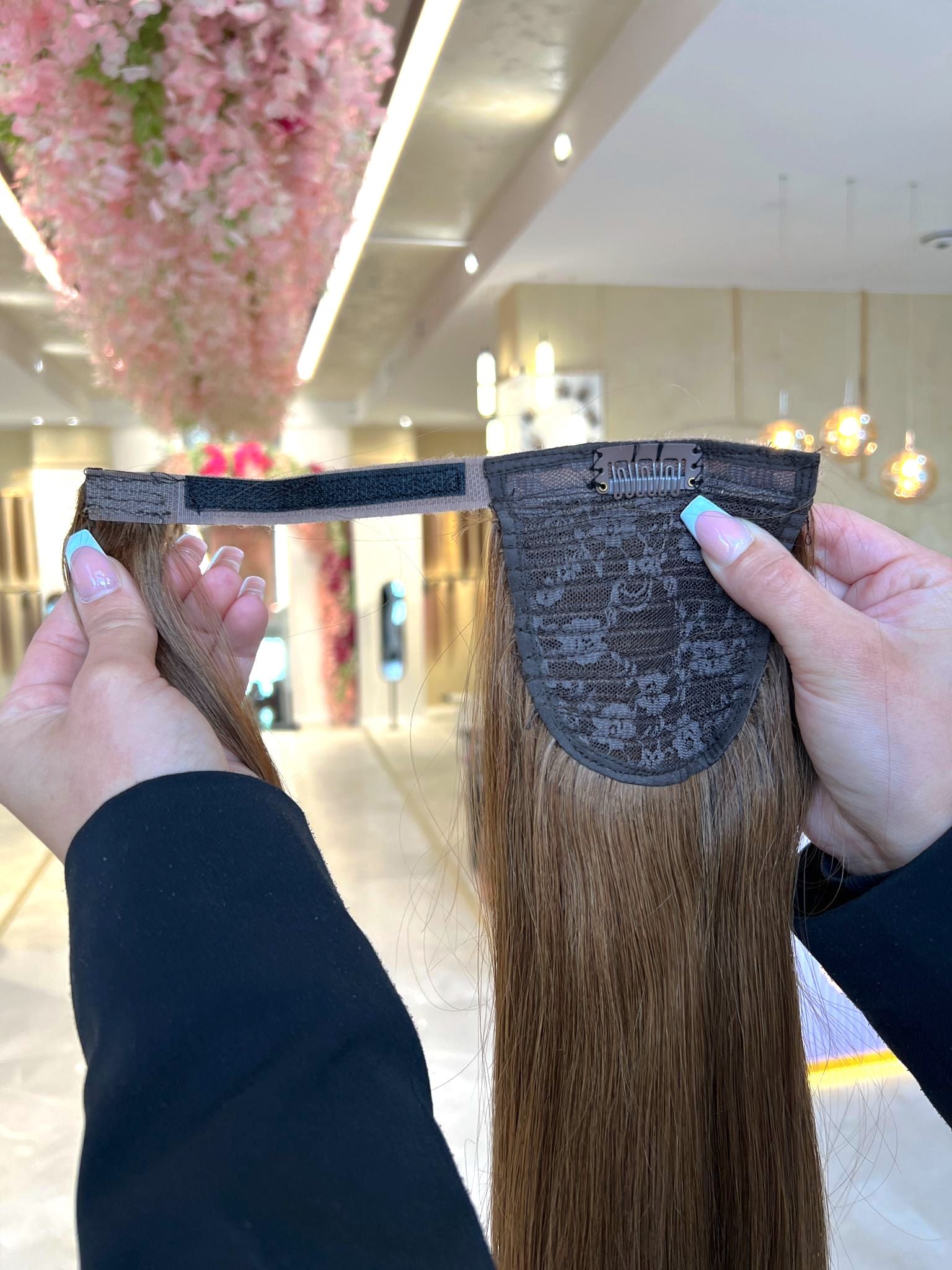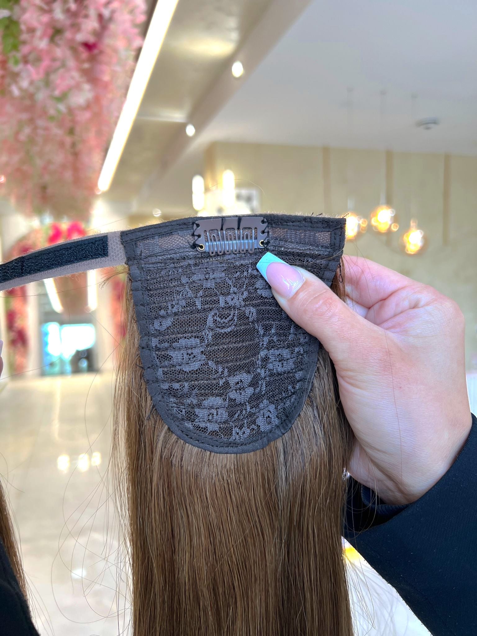 Ein Ponytail ist eine fertige Haarverlängerung in Zopfform, die mit einer kleinen Clip- oder Klettbefestigung am Eigenzopf angebracht wird. So zauberst du in wenigen Sekunden einen langen, voluminösen Pferdeschwanz.
