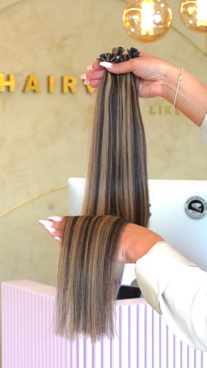 Unsere russischen Bonding-Extensions! Jede Strähne ist schmal und winzig, mit einem federleichten Gewicht von nur 1 Gramm, was sie perfekt für unauffälliges Tragen macht. Mit einer einheitlichen Länge von 63 cm bieten sie ein elegantes Erscheinungsbild. Die Strähnen sind bereits mit Keratinbondings versehen, sodass sie problemlos mit einer Wärmezange oder Ultraschall in dein Eigenhaar eingearbeitet werden können. Du hast sogar die Möglichkeit, sie problemlos wieder hochsetzen zu lassen. Bei richtiger Pflege versprechen wir dir eine langanhaltende Freude mit deinen Bonding-Extensions!