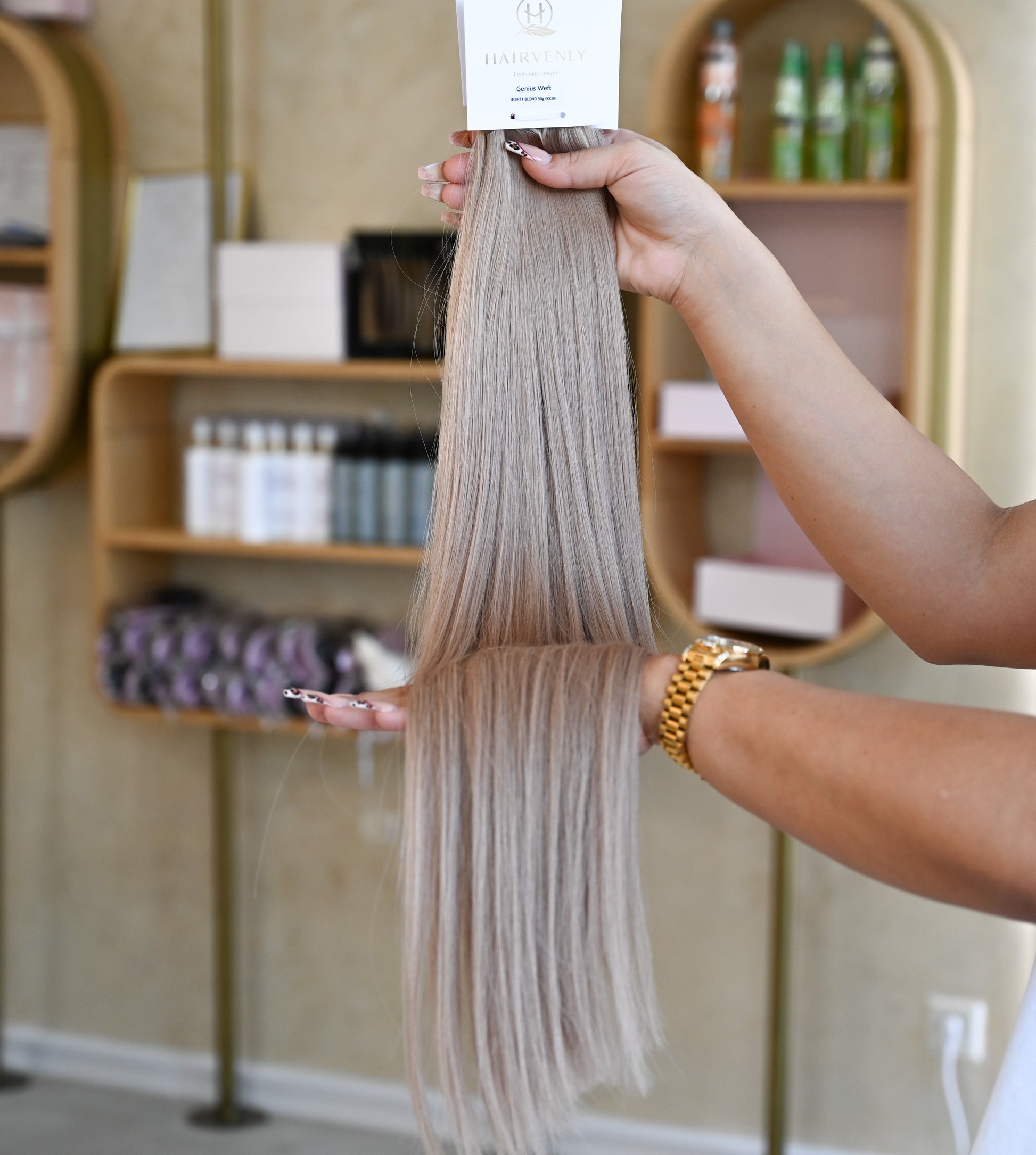 Für optimale Ergebnisse empfehlen wir unsere speziell entwickelte Pflegeserie „blessed“, die ideal auf die Bedürfnisse von Extensions abgestimmt ist.