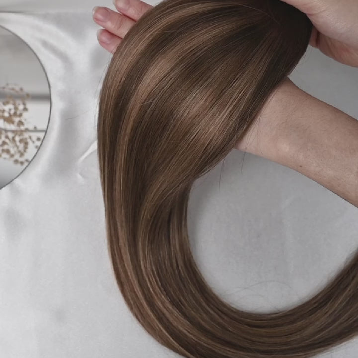 Gefertigt aus 100 % Remy-Echthaar, das wir streng selektieren. Seidig, glänzend, langlebig – Extensions, die sich anfühlen wie dein eigenes Haar.