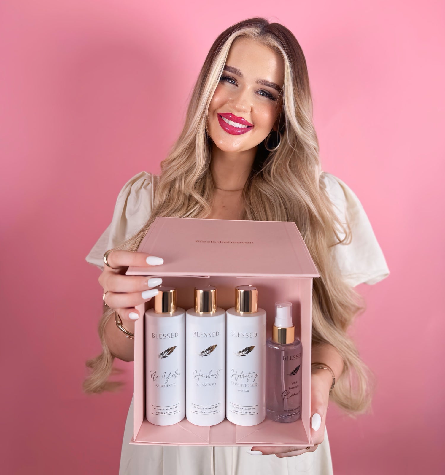 Blessed zeichnet sich dadurch aus, dass es frei von Parabenen ist und eine Vielzahl an wertvollen Nährstoffen wie Vitamin B5 enthält. Diese speziellen Inhaltsstoffe sind essenziell für die Pflege deiner Extensions und sorgen dafür, dass sie lange schön und tragbar bleiben. Blessed bietet deinem Haar ein wahres Festmahl an Pflege: Es verleiht sowohl deinen Extensions als auch deinem Eigenhaar Geschmeidigkeit und Glanz.