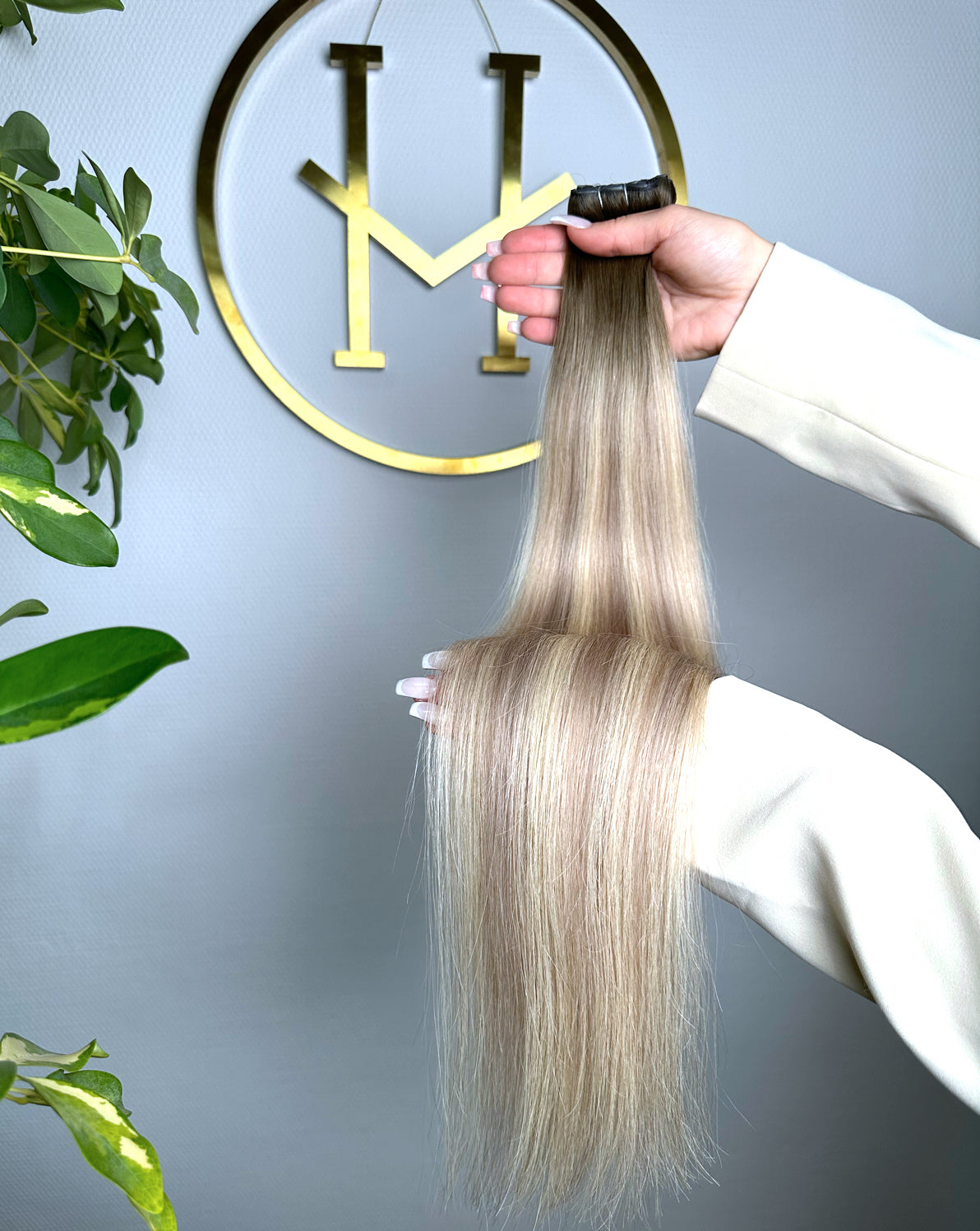 Die Invisible Tressen sind ein absolutes Unikat. Was sie von herkömmlichen Tressen unterscheidet, ist ihre innovative Aufklappbarkeit. An den Verbindungsstellen befinden sich feine Härchen, die dafür sorgen, dass die Tressen nahezu unsichtbar sind. Diese besondere Eigenschaft macht sie zu einer herausragenden Wahl für alle, die nach einer unauffälligen und natürlichen Haarverlängerung suchen.