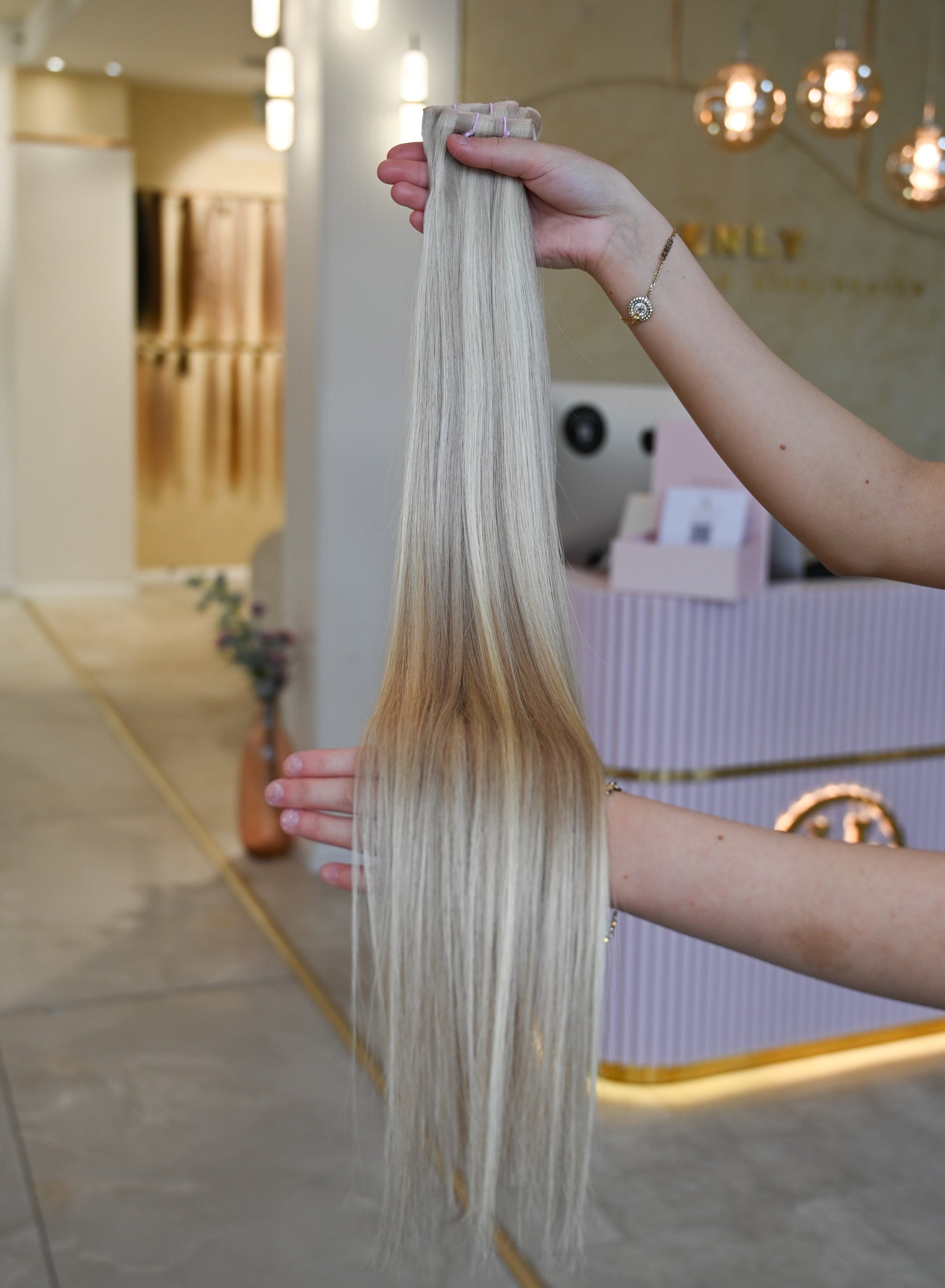 Die Invisible Tressen sind ein absolutes Unikat. Was sie von herkömmlichen Tressen unterscheidet, ist ihre innovative Aufklappbarkeit. An den Verbindungsstellen befinden sich feine Härchen, die dafür sorgen, dass die Tressen nahezu unsichtbar sind. Diese besondere Eigenschaft macht sie zu einer herausragenden Wahl für alle, die nach einer unauffälligen und natürlichen Haarverlängerung suchen.