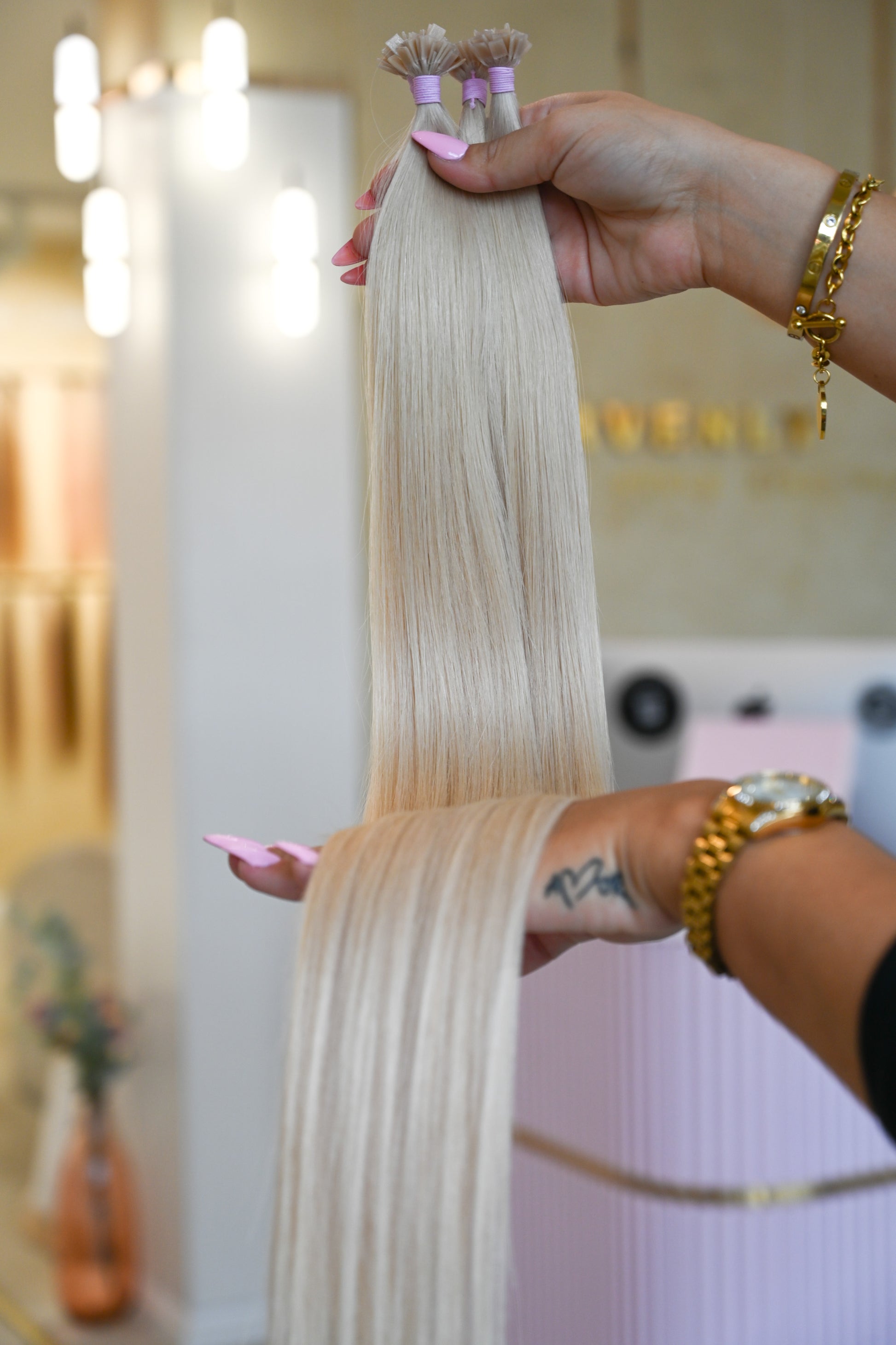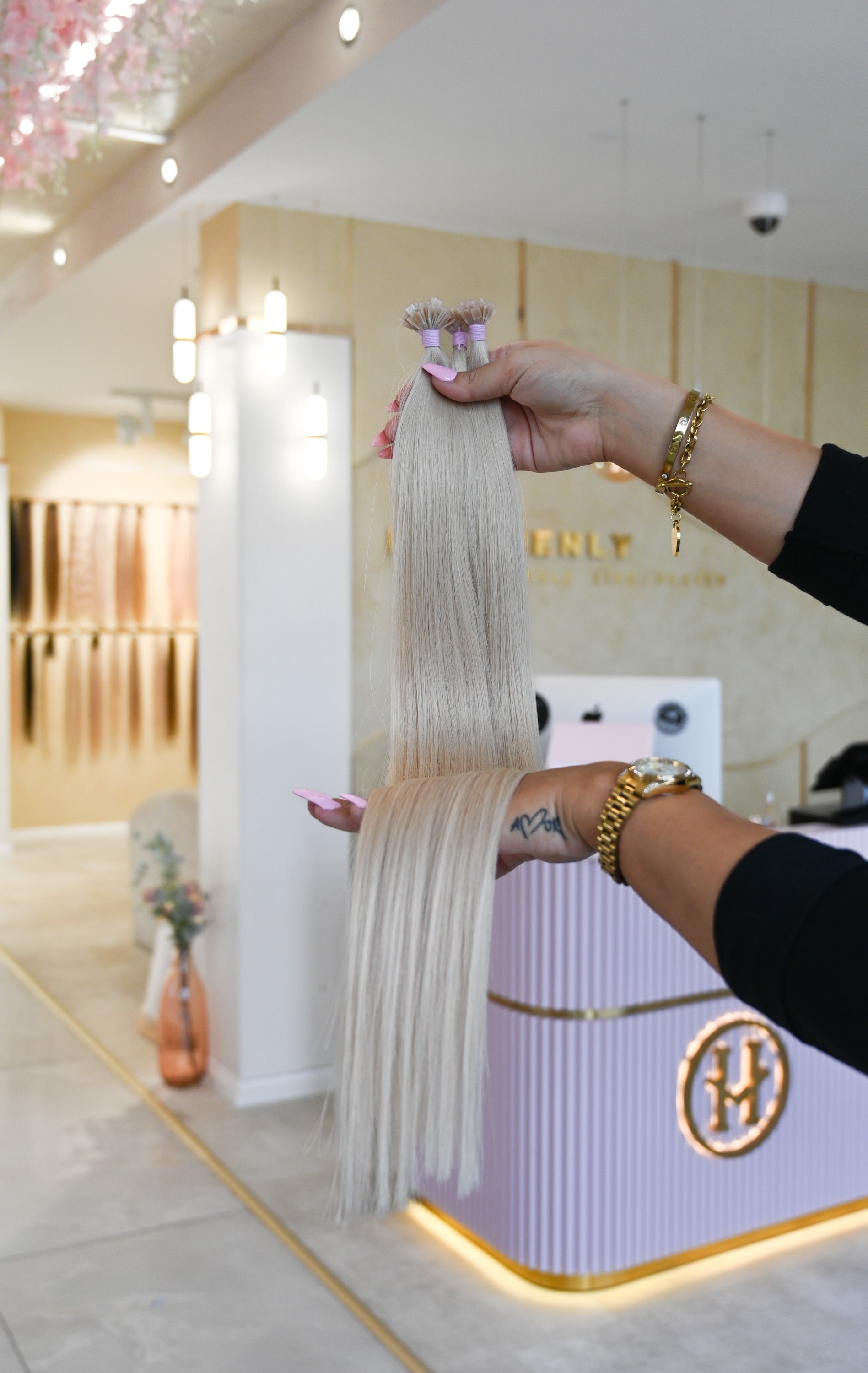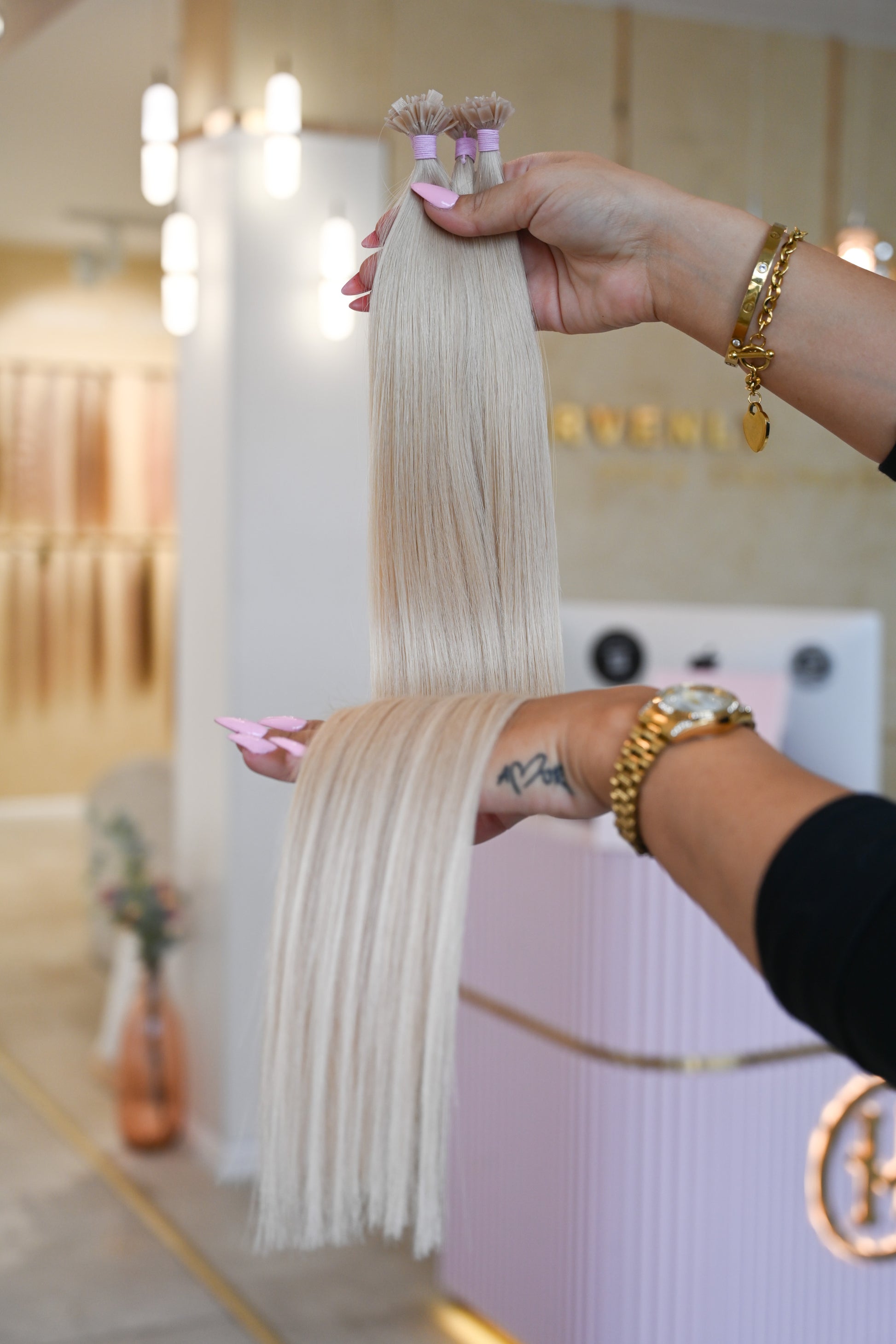 Für optimale Ergebnisse empfehlen wir unsere speziell entwickelte Pflegeserie „blessed“, die ideal auf die Bedürfnisse von Extensions abgestimmt ist.