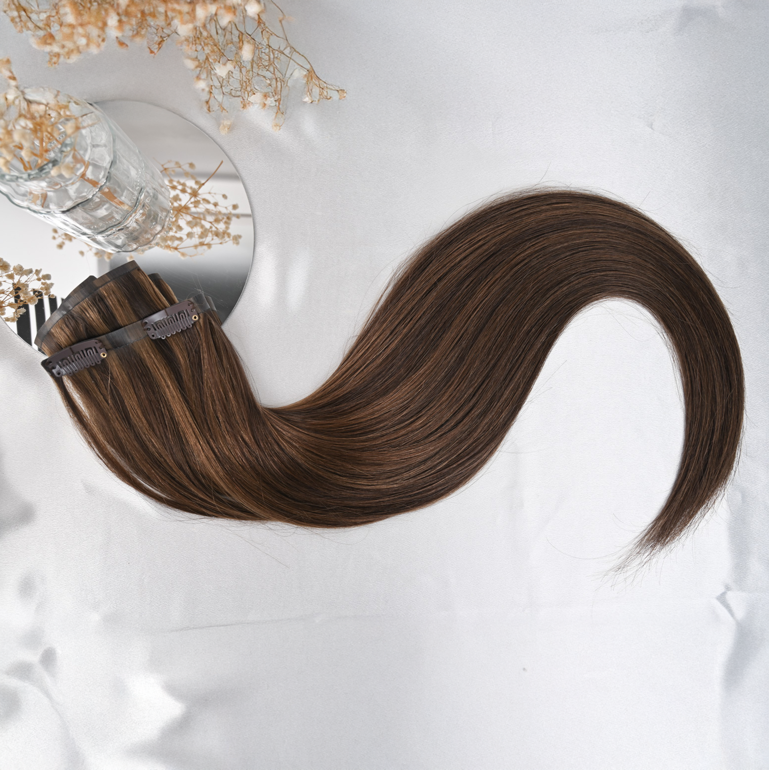Unsere Invisible Clip-Ins setzen neue Maßstäbe: ultraflache Verbindungsstellen und farblich angepasste Clips. Niemand sieht, dass du Extensions trägst – sie verschmelzen perfekt mit deinem Haar.