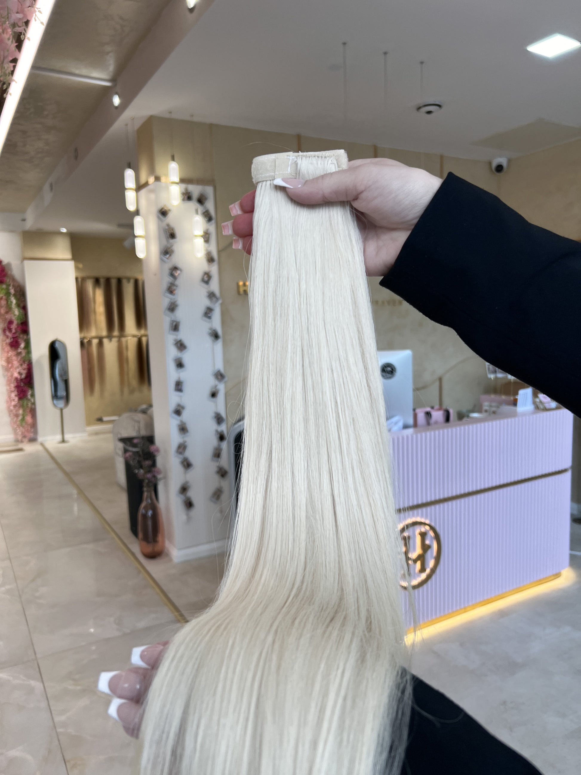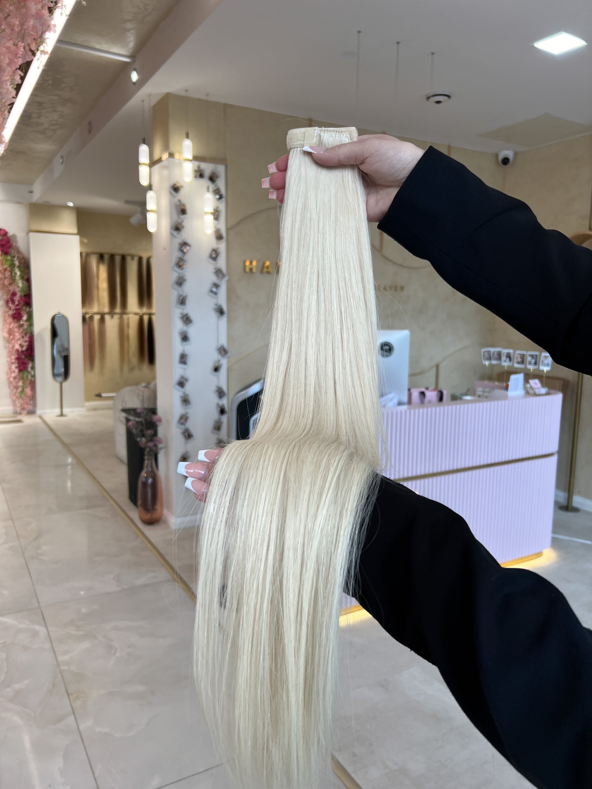 Für optimale Ergebnisse empfehlen wir unsere speziell entwickelte Pflegeserie „blessed“, die ideal auf die Bedürfnisse von Extensions abgestimmt ist.