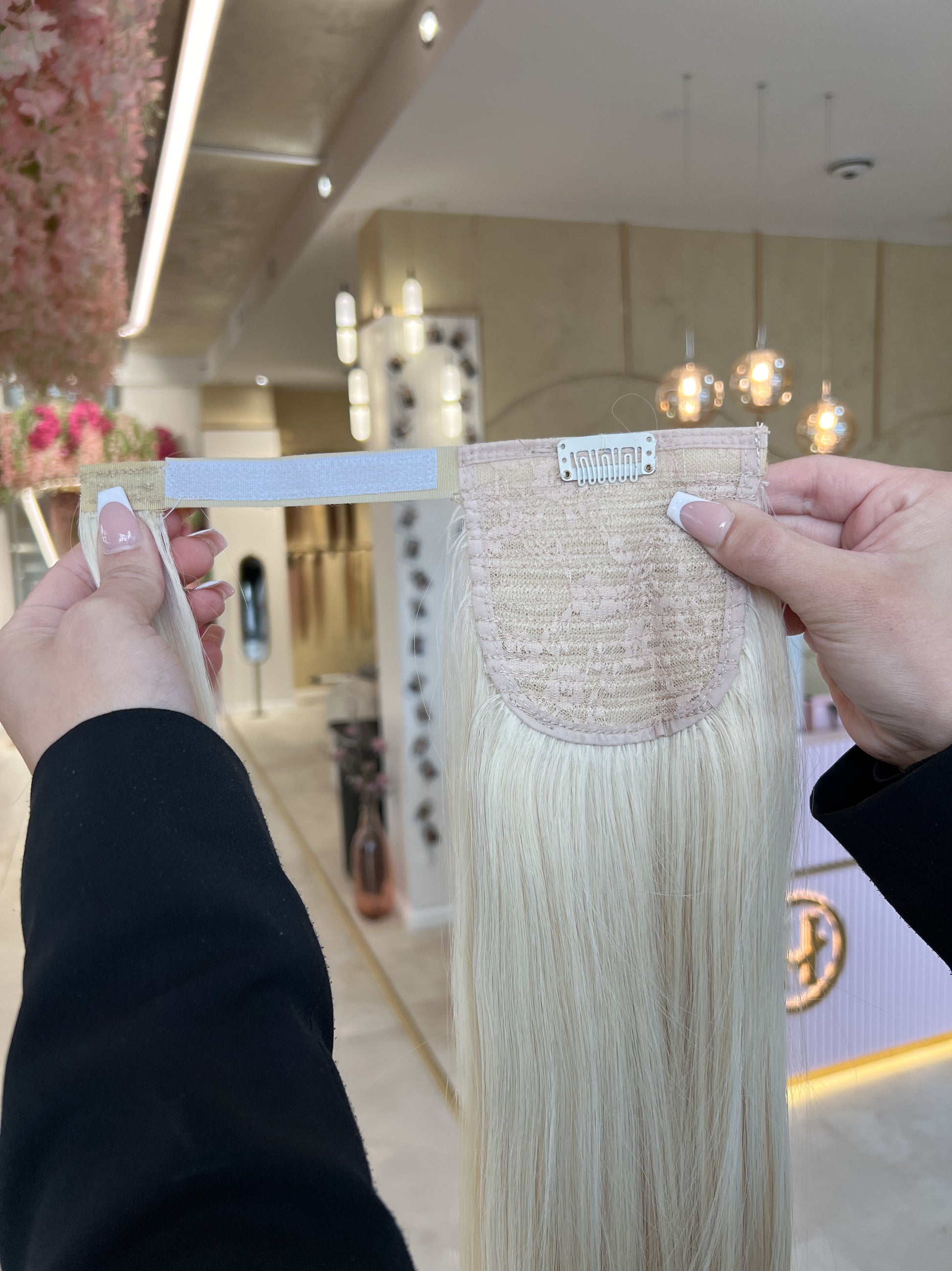 Ein Ponytail ist eine fertige Haarverlängerung in Zopfform, die mit einer kleinen Clip- oder Klettbefestigung am Eigenzopf angebracht wird. So zauberst du in wenigen Sekunden einen langen, voluminösen Pferdeschwanz.