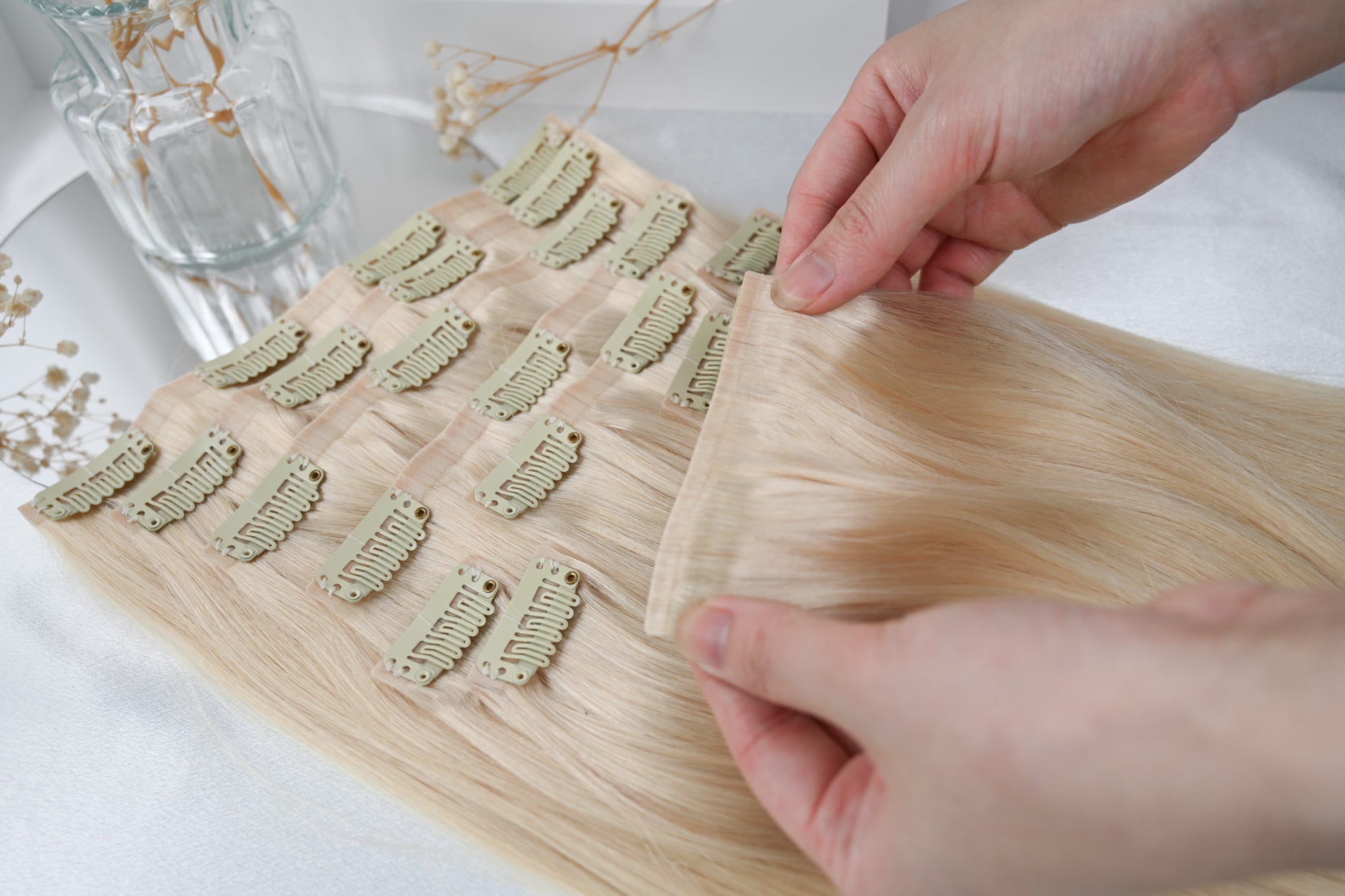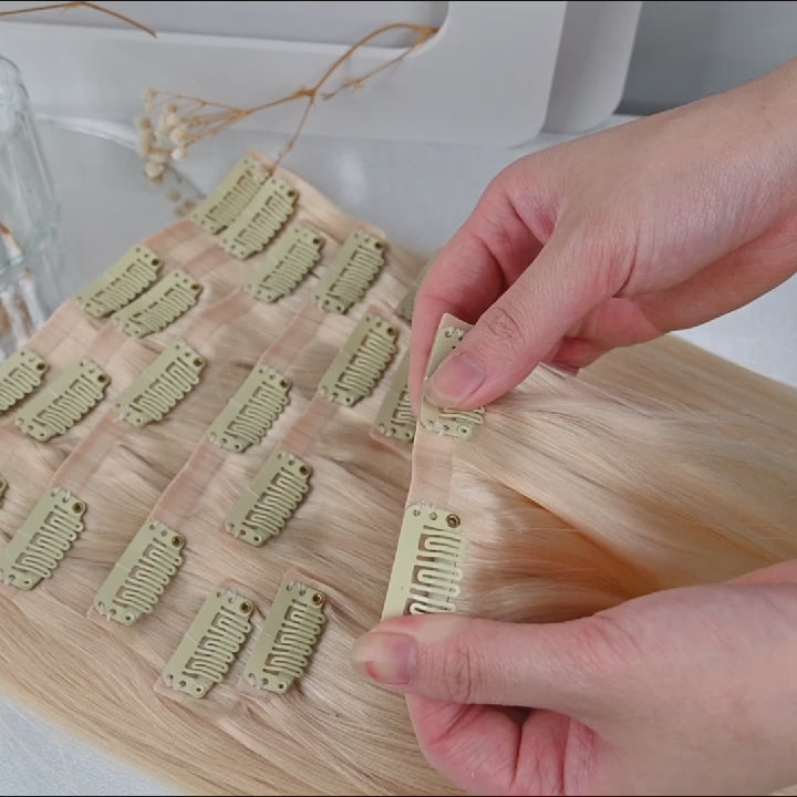 Jeder Clip ist silikonbeschichtet und sorgfältig gefertigt, um maximalen Halt zu bieten, ohne dein Eigenhaar zu belasten. Kein Ziepen, kein Haarbruch, nur sicherer, angenehmer Tragekomfort.