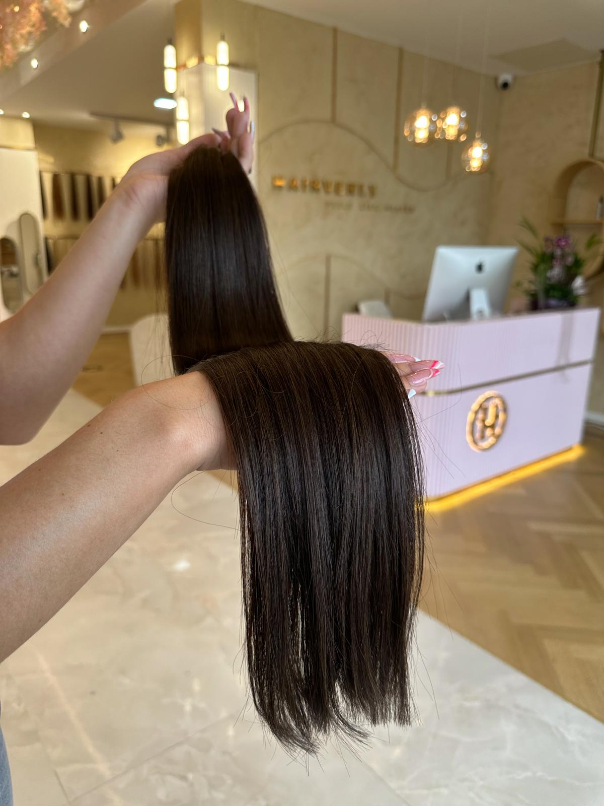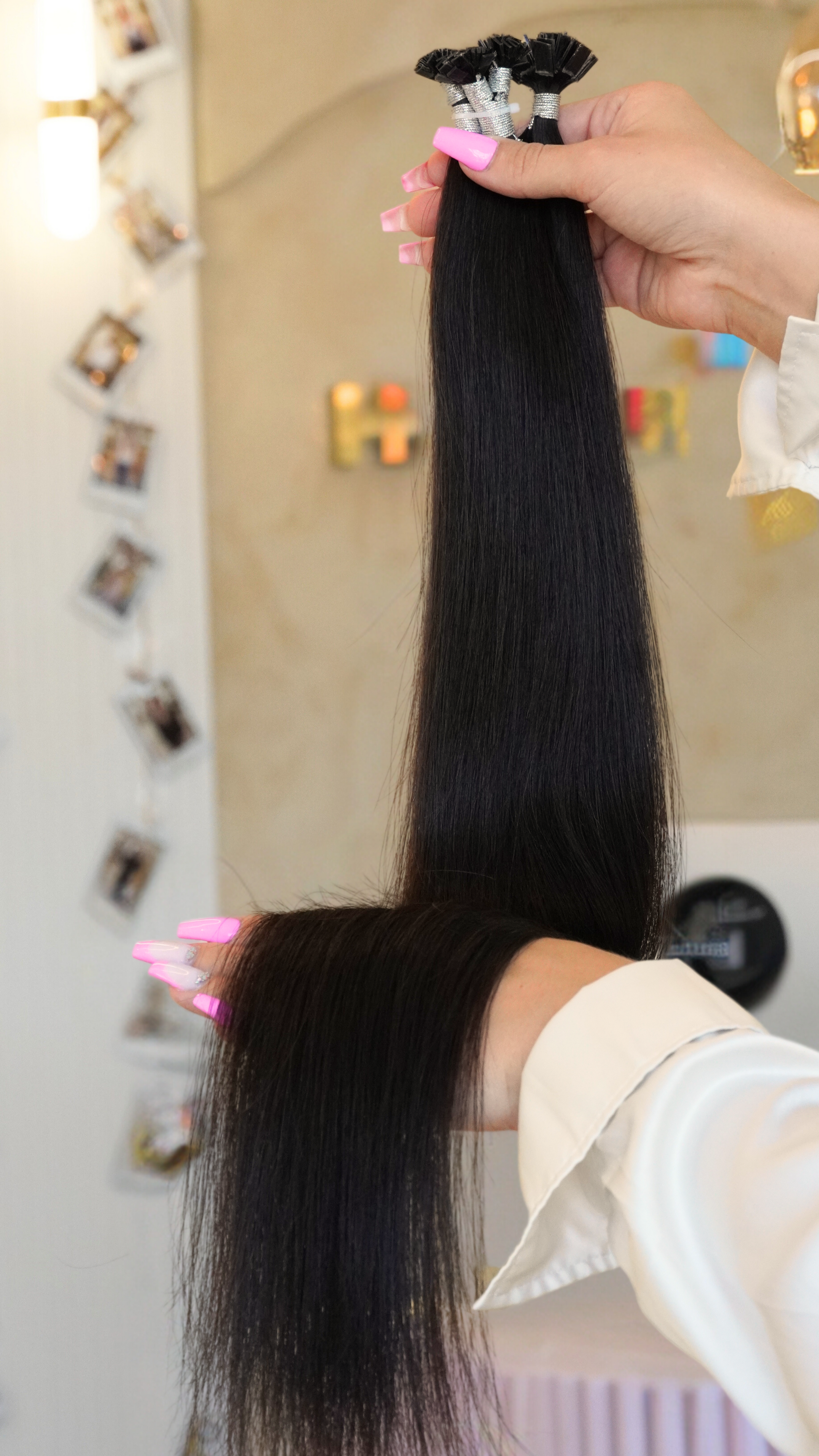 Unsere russischen Bonding-Extensions! Jede Strähne ist schmal und winzig, mit einem federleichten Gewicht von nur 1 Gramm, was sie perfekt für unauffälliges Tragen macht. Mit einer einheitlichen Länge von 63 cm bieten sie ein elegantes Erscheinungsbild. Die Strähnen sind bereits mit Keratinbondings versehen, sodass sie problemlos mit einer Wärmezange oder Ultraschall in dein Eigenhaar eingearbeitet werden können. Du hast sogar die Möglichkeit, sie problemlos wieder hochsetzen zu lassen. Bei richtiger Pflege versprechen wir dir eine langanhaltende Freude mit deinen Bonding-Extensions!
