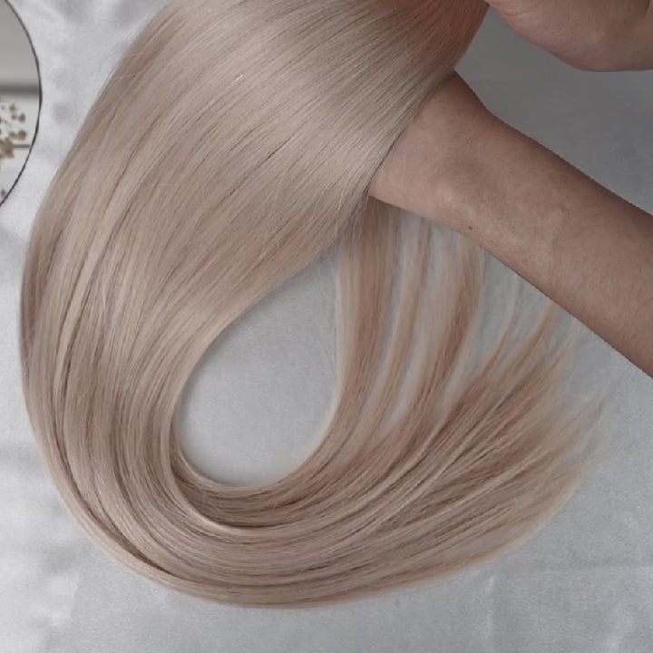 Gefertigt aus 100 % Remy-Echthaar, das wir streng selektieren. Seidig, glänzend, langlebig, Extensions, die sich anfühlen wie dein eigenes Haar.