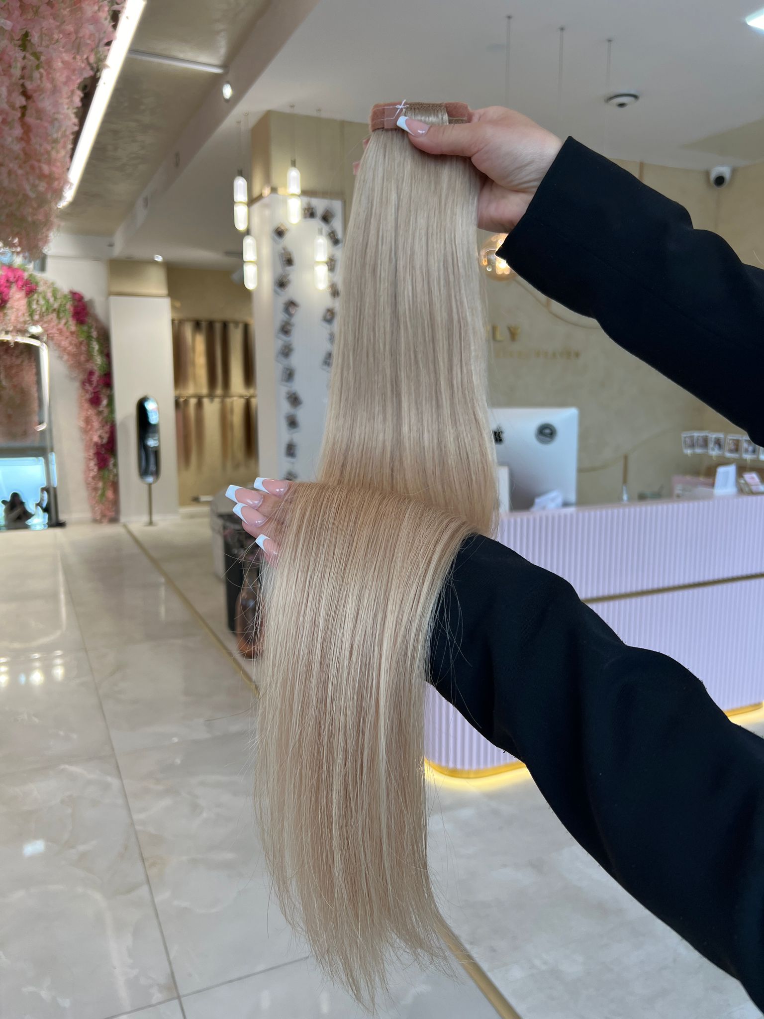 Für optimale Ergebnisse empfehlen wir unsere speziell entwickelte Pflegeserie „blessed“, die ideal auf die Bedürfnisse von Extensions abgestimmt ist.