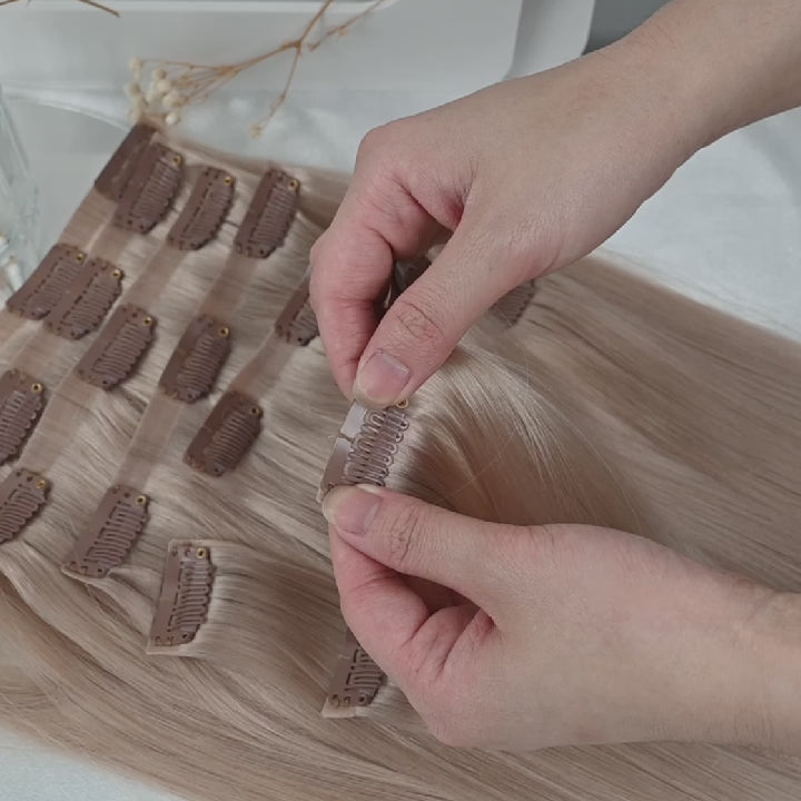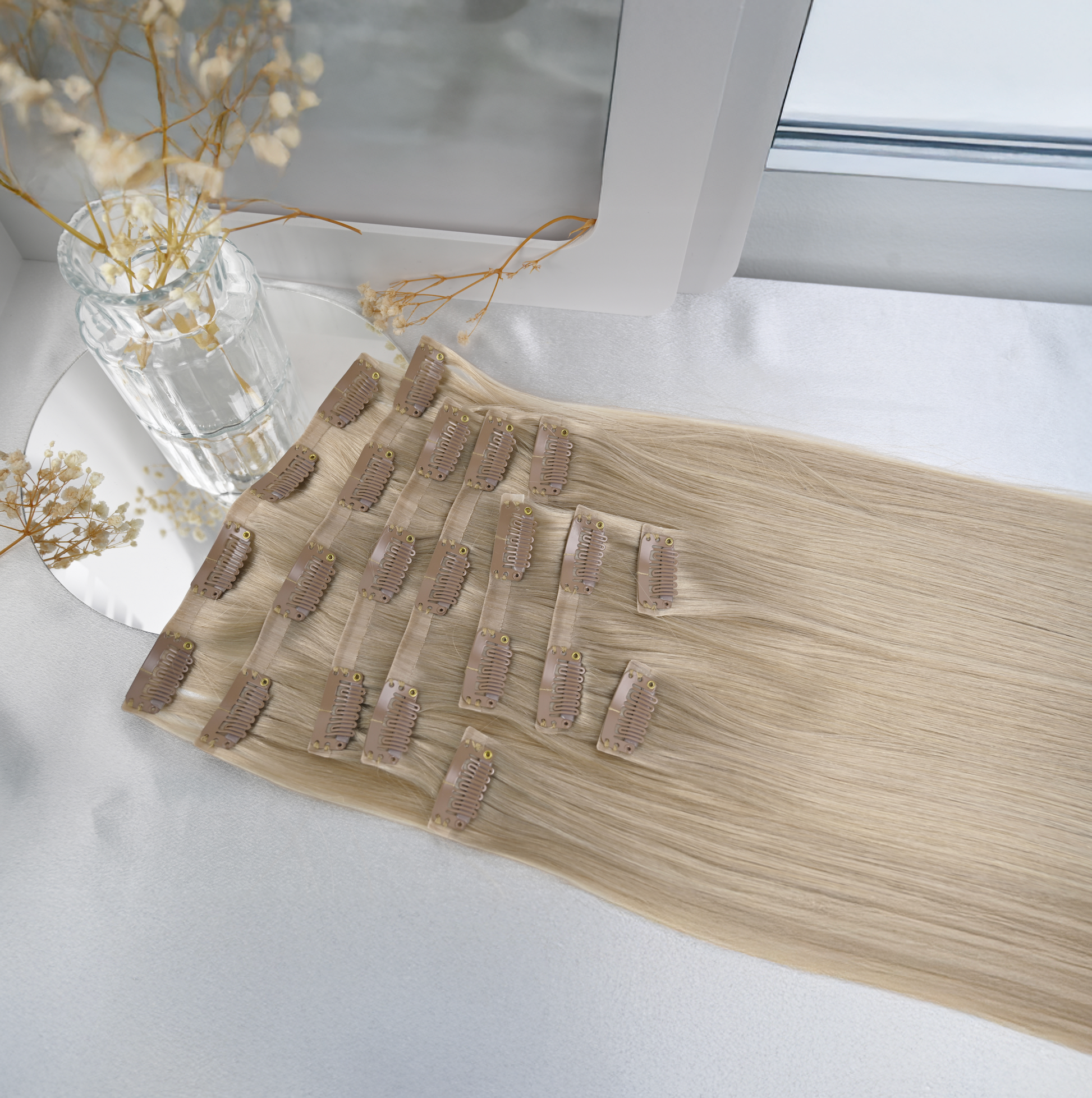 Unsere Extensions besitzen eine natürliche, auslaufende Spitze, bei der das Haar am Ansatz voller ist und zu den Spitzen hin sanft feiner wird, genau wie echtes, natürlich gewachsenes Haar. Das ist tatsächlich ein Premium-Merkmal, denn nur hochwertige Clip-In Extensions bilden diesen natürlichen Verlauf nach und sorgen so für ein besonders authentisches, fließendes Volumen mit eleganter Bewegung.