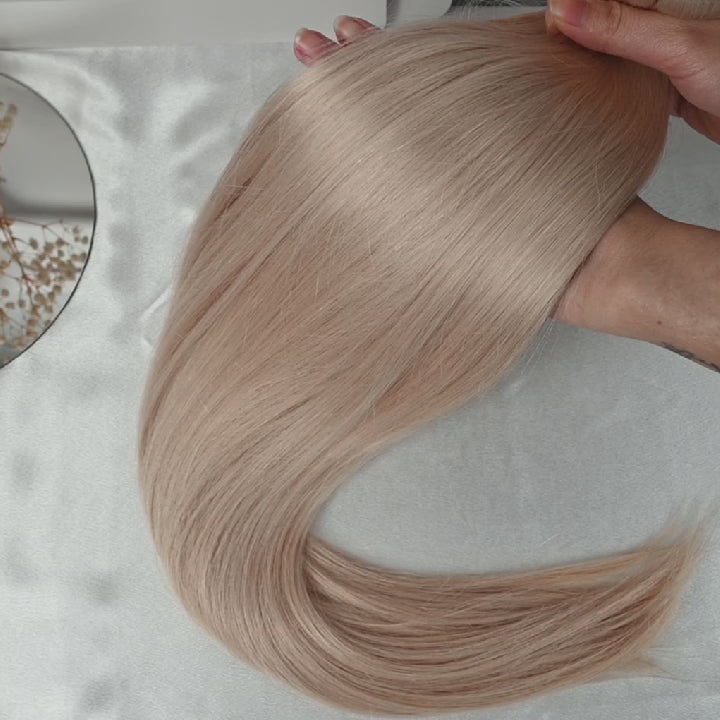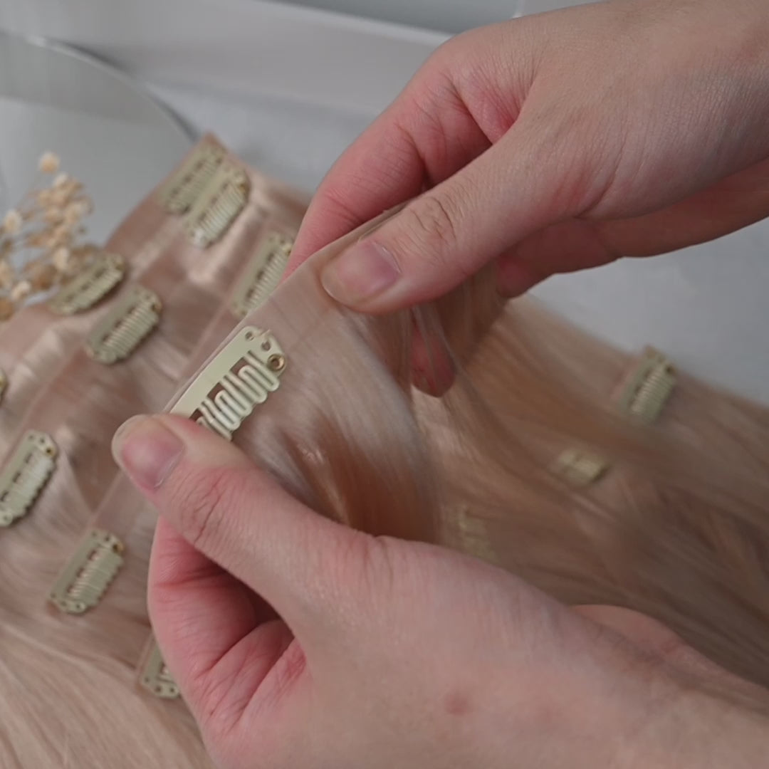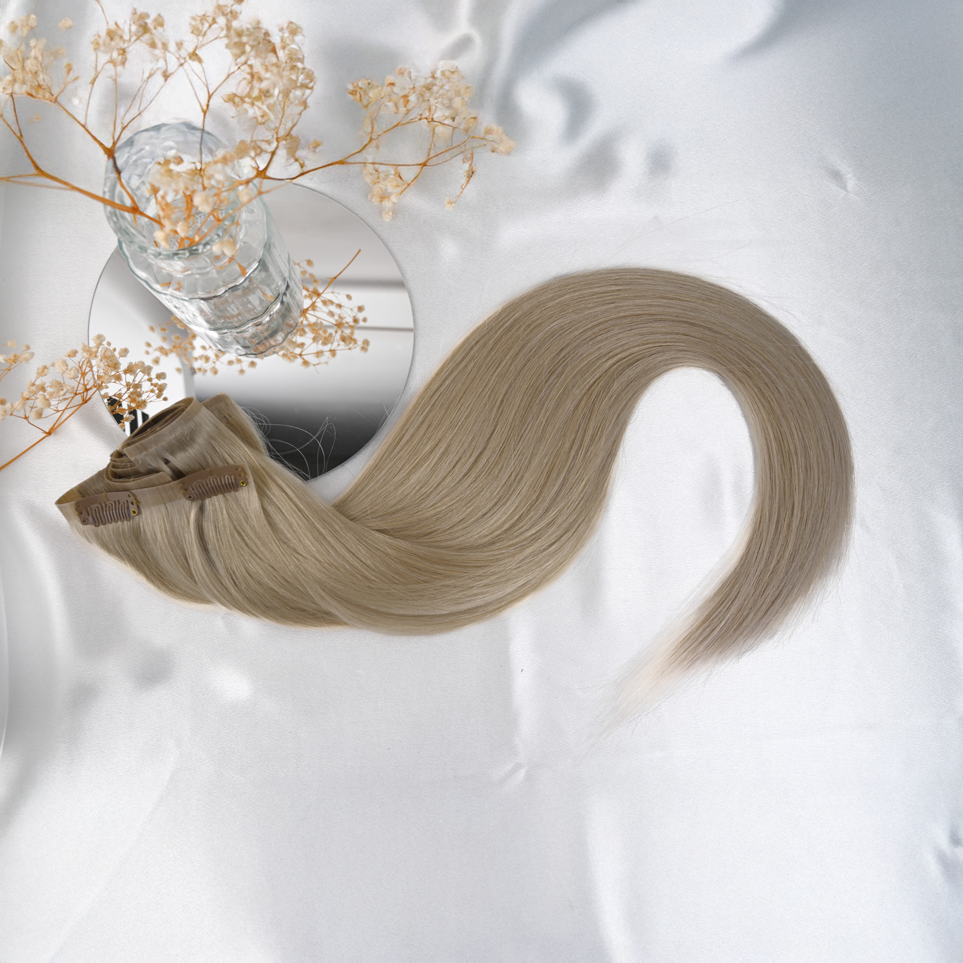 Unsere Extensions besitzen eine natürliche, auslaufende Spitze, bei der das Haar am Ansatz voller ist und zu den Spitzen hin sanft feiner wird, genau wie echtes, natürlich gewachsenes Haar. Das ist tatsächlich ein Premium-Merkmal, denn nur hochwertige Clip-In Extensions bilden diesen natürlichen Verlauf nach und sorgen so für ein besonders authentisches, fließendes Volumen mit eleganter Bewegung.