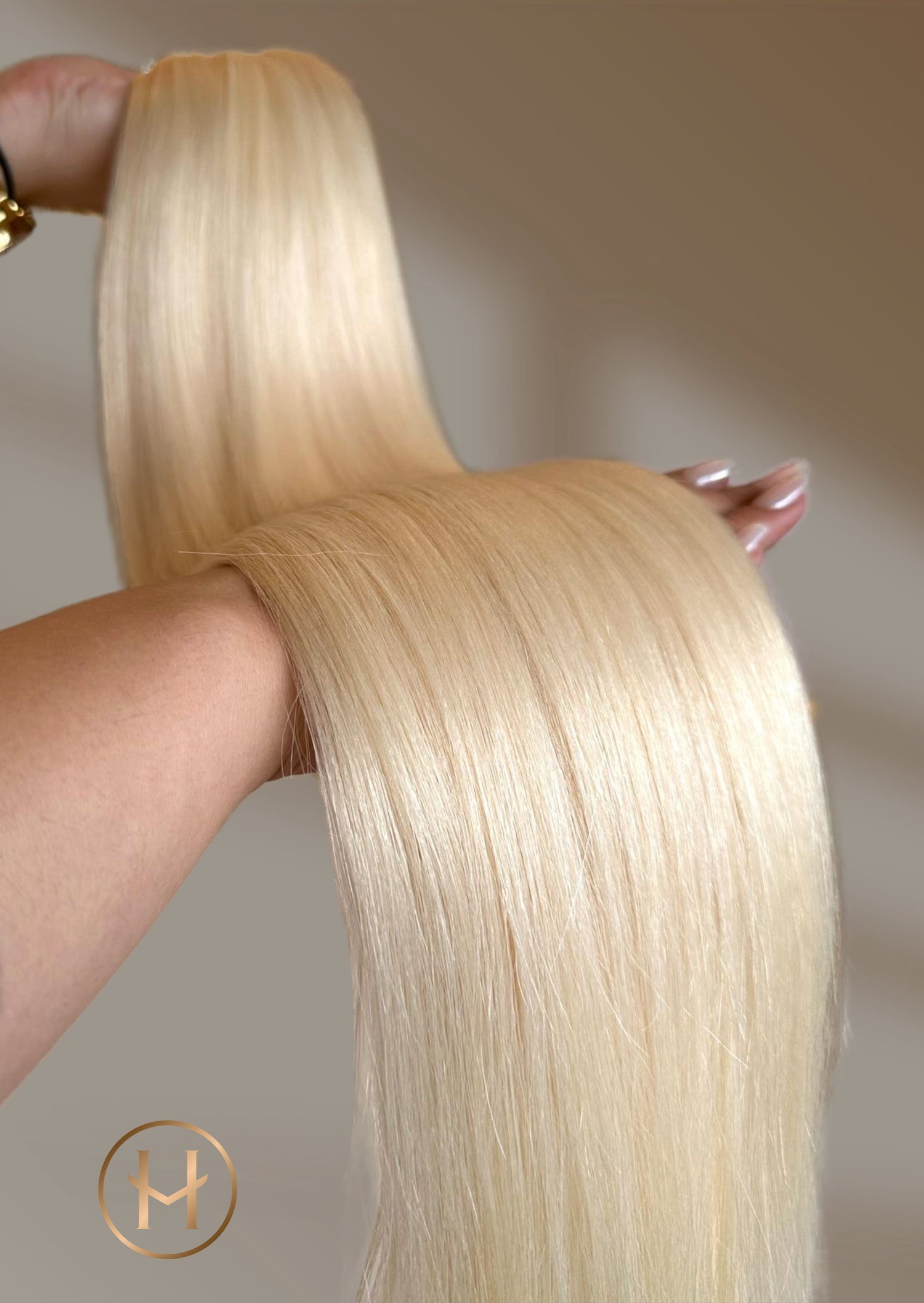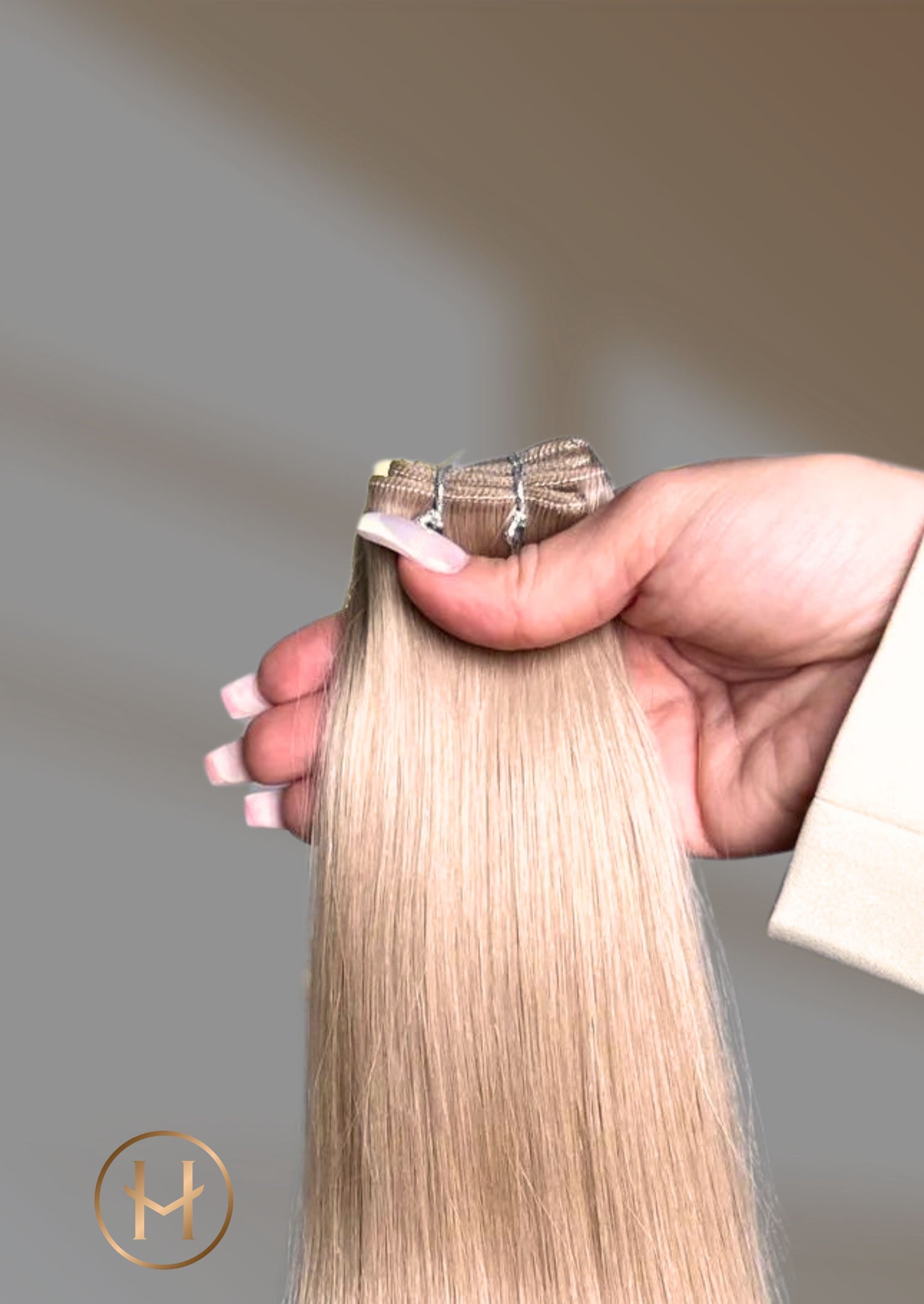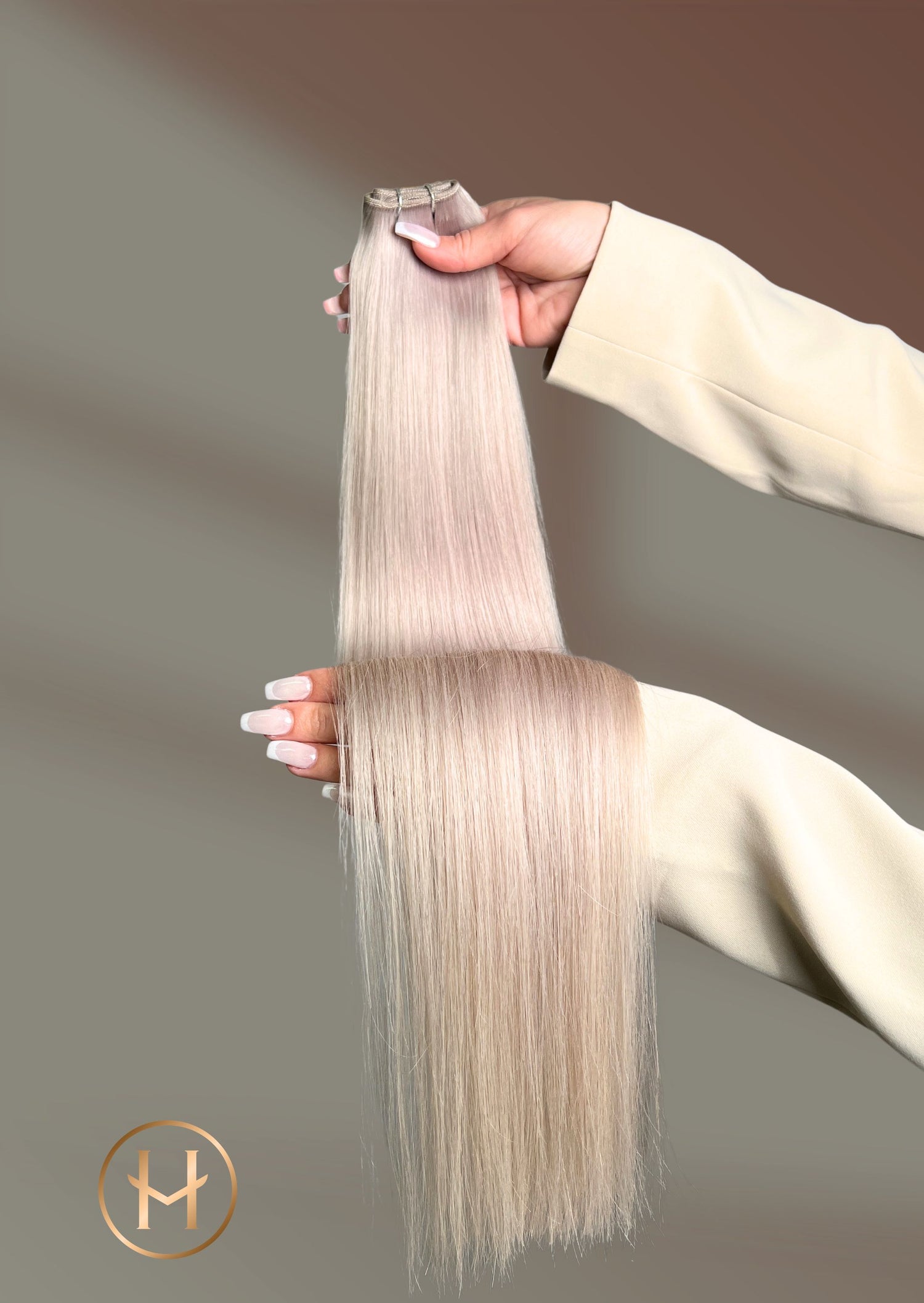 Unsere russischen Tressen sind die ultimative Lösung für haarschonende Haarverlängerungen. Mit vielseitigen Anbringungsmöglichkeiten bieten sie sowohl Verdichtung als auch eine vollständige Haarverlängerung. Das besondere Merkmal: schmale Verbindungen von 45 cm Breite.