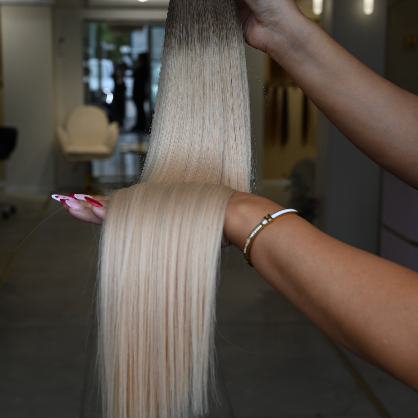 Für optimale Ergebnisse empfehlen wir unsere speziell entwickelte Pflegeserie „blessed“, die ideal auf die Bedürfnisse von Extensions abgestimmt ist.