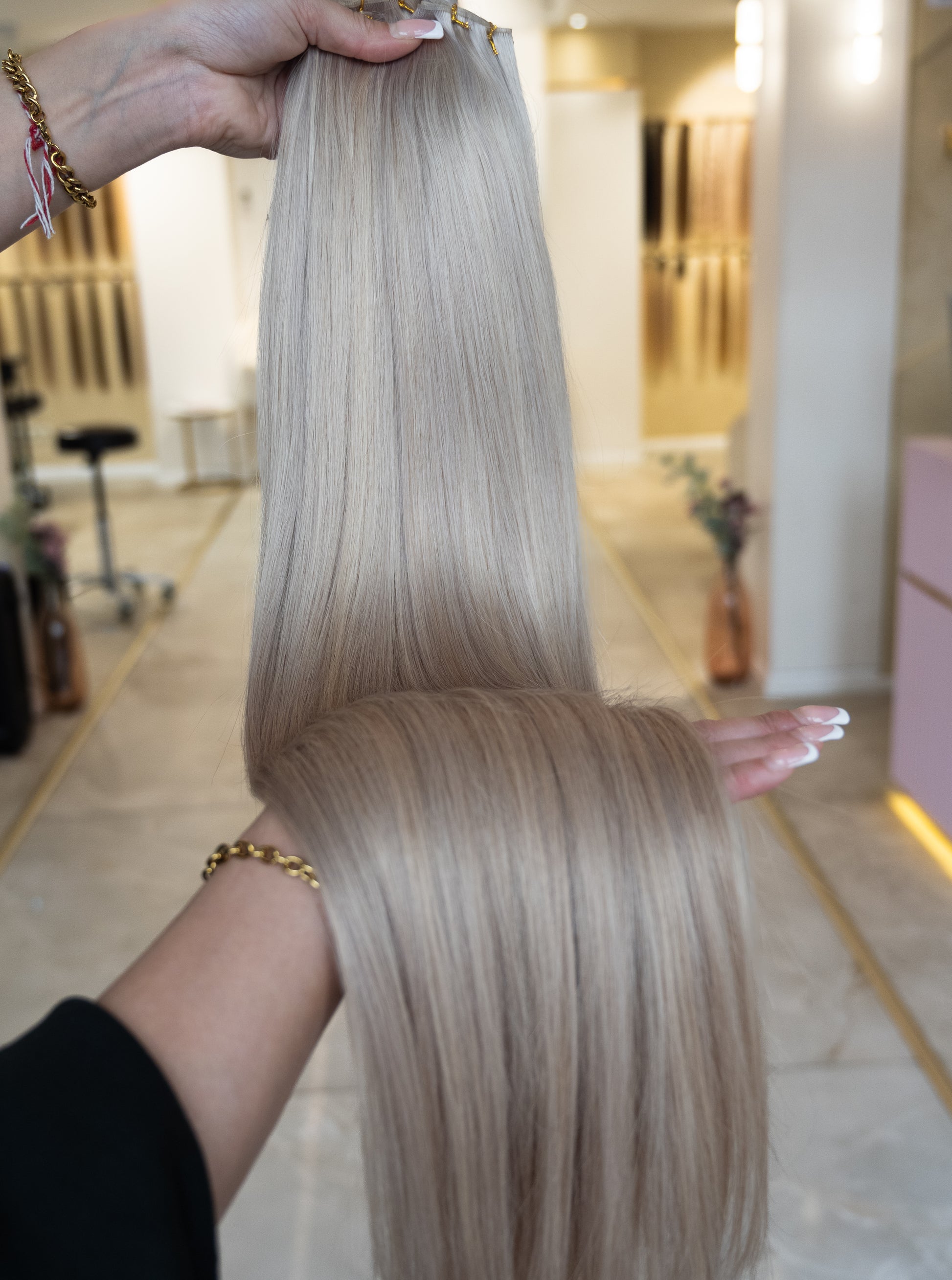 Für optimale Ergebnisse empfehlen wir unsere speziell entwickelte Pflegeserie „blessed“, die ideal auf die Bedürfnisse von Extensions abgestimmt ist.